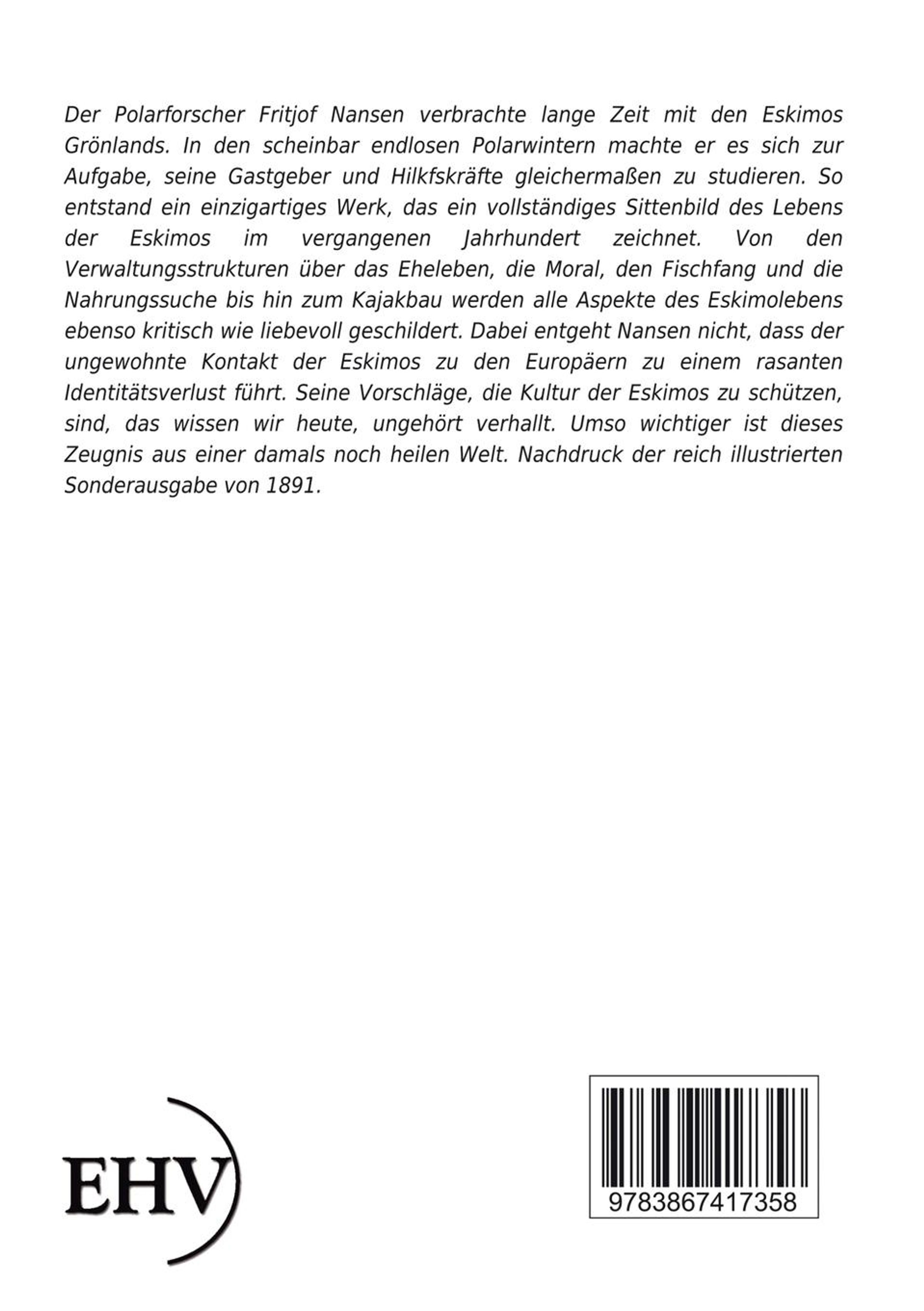 Der Polarforscher Fritjof Nansen verbrachte lange Zeit mit den Eskimos Grönlands. In den scheinbar endlosen Polarwintern machte er es sich zur Aufgabe, seine Gastgeber und Hilkfskräfte gleichermaßen zu studieren. So entstand ein einzigartiges Werk, das ein vollständiges Sittenbild des Lebens der Eskimos im vergangenen Jahrhundert zeichnet. Von den Verwaltungsstrukturen über das Eheleben, die Moral, den Fischfang und die Nahrungssuche bis hin zum Kajakbau werden alle Aspekte des Eskimolebens ebenso kritisch wie liebevoll geschildert. Dabei entgeht Nansen nicht, dass der ungewohnte Kontakt der Eskimos zu den Europäern zu einem rasanten Identitätsverlust führt. Seine Vorschläge, die Kultur der Eskimos zu schützen, sind, das wissen wir heute, ungehört verhallt. Umso wichtiger ist dieses Zeugnis aus einer damals noch heilen Welt. Nachdruck der reich illustrierten Sonderausgabe von 1891.