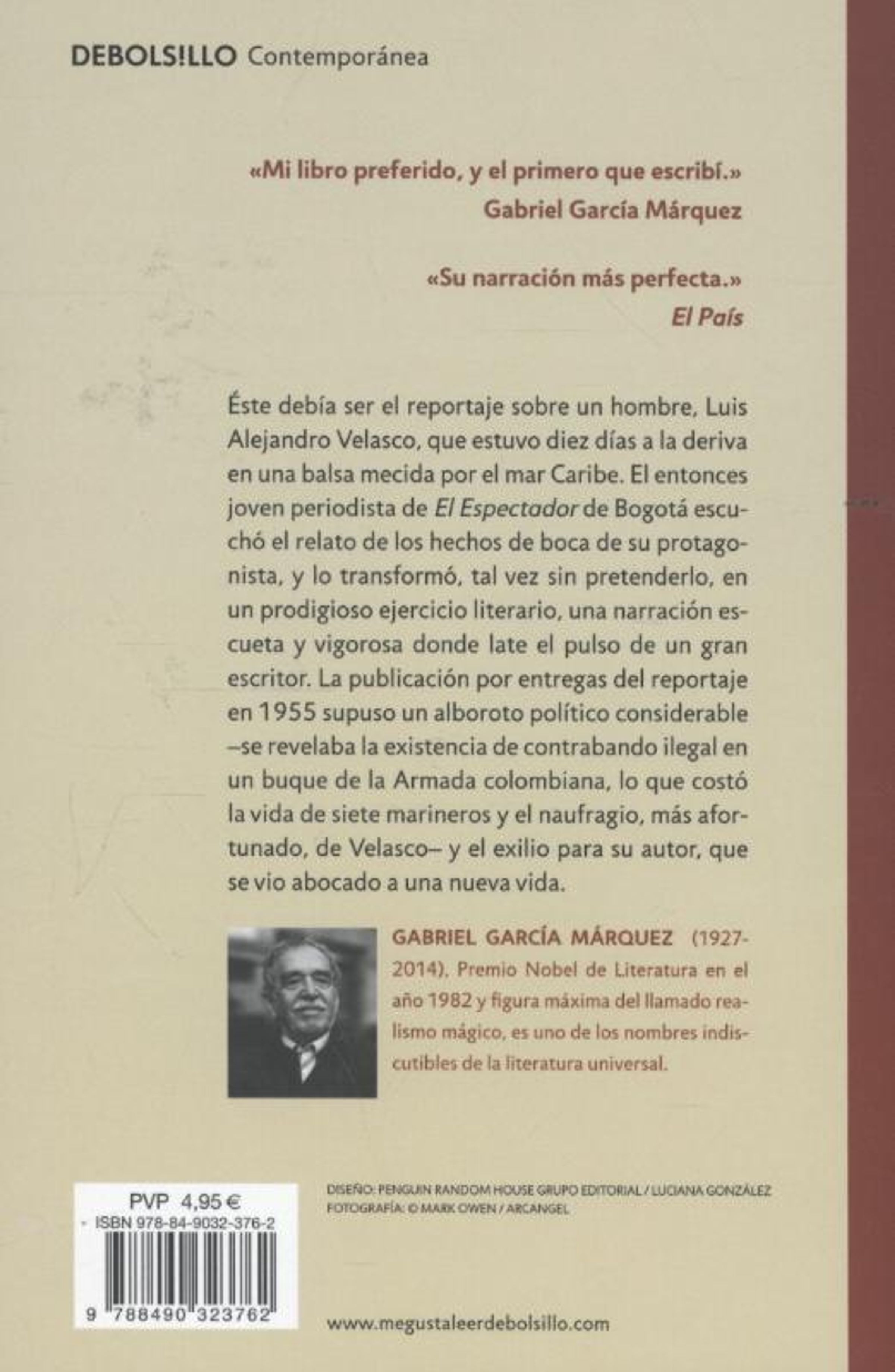 El periplo desnudo y descarnado de un marinero a la deriva. Y el relato que le costó el exilio a Gabriel García Márquez. 'Mi libro preferido, y el primero que escribí.' Gabriel García Márquez Con este libro, Gabriel García Márquez se descubrió a sí mismo como un narrador. Sin embargo, la intención primera era escribir un reportaje sobre un hombre, Luis Alejandro Velasco, que estuvo diez días a la deriva en una balsa mecida por el mar Caribe. El futuro Nobel de Literatura y entonces joven reportero que era García Márquez escuchó el relato de los hechos de boca de su protagonista y los transformó, tal vez sin pretenderlo, en un prodigioso ejercicio literario, una narración escueta y vigorosa donde late el pulso de un gran escritor. La publicación por entregas del reportaje en El Espectador de Bogotá supuso un alboroto político considerable -se revelaba la existencia de contrabando ilegal en un buque de la Armada colombiana, lo que costó la vida de siete marineros y el naufragio, más afortunado, de Velasco- y el exilio para su autor. 'El 22 de febrero nos anunció que regresaríamos a Colombia. Teníamos ocho meses de estar en Mobile, Alabama, Estados Unidos, donde el A. R.C. Caldas fue sometido a reparaciones electrónicas y de sus armamentos. En los días de franquicia hacíamos lo que hacen todos los marineros en tierra: íbamos al cine con la novia y nos reuníamos después en Joe Palooka, una taberna del puerto, donde tomábamos whisky y armábamos una bronca de vez en cuando.' La crítica dijo... 'Su narración más perfecta.' El País