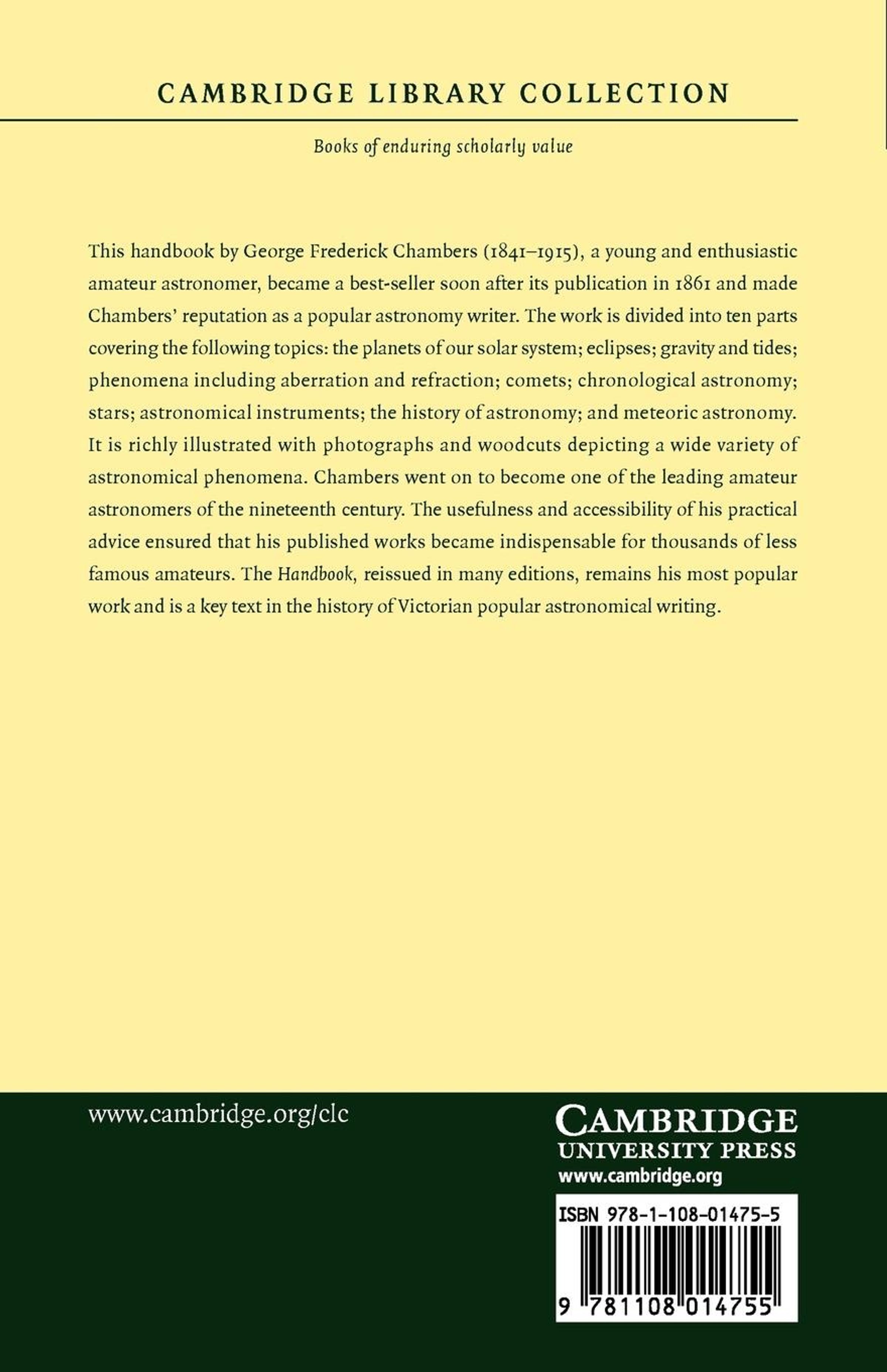 This handbook by George Frederick Chambers (1841-1915), a young and enthusiastic amateur astronomer, became a best-seller soon after its publication in 1861 and made Chambers' reputation as a popular astronomy writer. The work is divided into ten parts covering the following topics: the planets of our solar system; eclipses; gravity and tides; phenomena including aberration and refraction; comets; chronological astronomy; stars; astronomical instruments; the history of astronomy; and meteoric astronomy. It is richly illustrated with photographs and woodcuts depicting a wide variety of astronomical phenomena. Chambers went on to become one of the leading amateur astronomers of the nineteenth century. The usefulness and accessibility of his practical advice ensured that his published works became indispensable for thousands of less famous amateurs. The Handbook, reissued in many editions, remains his most popular work and is a key text in the history of Victorian popular astronomical writing.