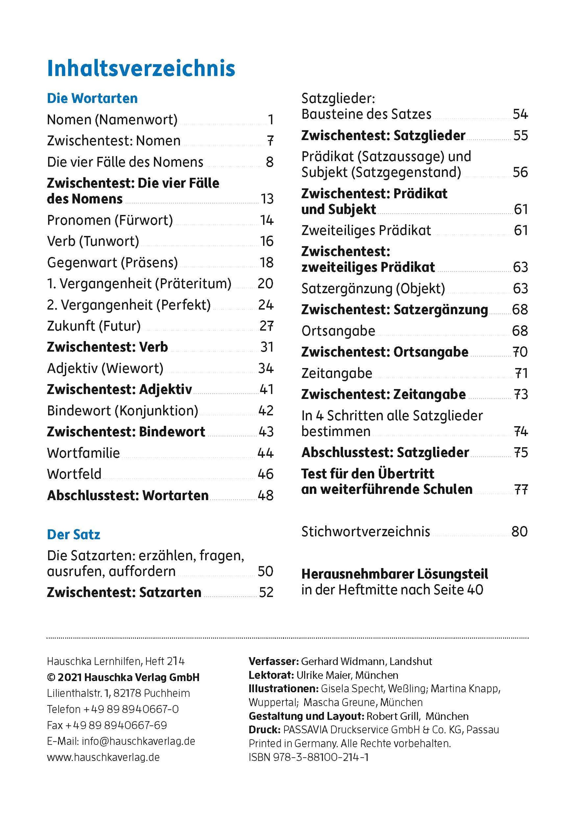 Diese Hauschka-Lernhilfe betrachtet die wichtigsten Wortarten und Satzglieder. Zu jedem Abschnitt gibt es zahlreiche Übungen, ausführliche Erklärungen sowie Merkkästen, die einen kurzen Überblick über die wichtigsten Regeln geben. Jeder Thematik folgt ein Zwischentest, bei dem das Gelernte noch einmal überprüft wird. Außerdem bietet das letzte Kapitel Aufgaben für den Übertritt an weiterführende Schulen. Die Grammatik in Stichwörtern ermöglicht einen kurzen, gezielten Überblick über die einzelnen Grammatikbereiche. Der Lösungsteil in der Mitte des Heftes ist herausnehmbar.