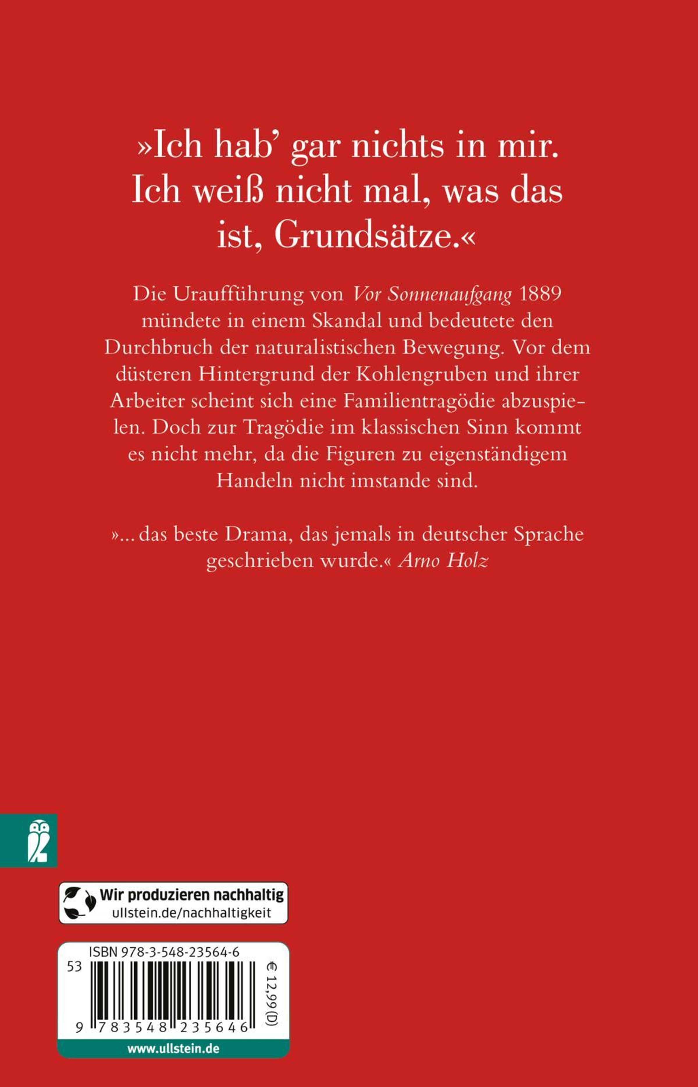 Die Uraufführung von Vor Sonnenaufgang 1889 mündete in einen Skandal und bedeutete den Durchbruch der naturalistischen Bewegung. Vor dem düsteren Hintergrund der Kohlengruben und ihrer Arbeiter scheint sich eine Familientragödie abzuspielen. Doch zur Tragödie im klassischen Sinn kommt es nicht mehr, da die Figuren zu eigenständigem Handeln nicht imstande sind.