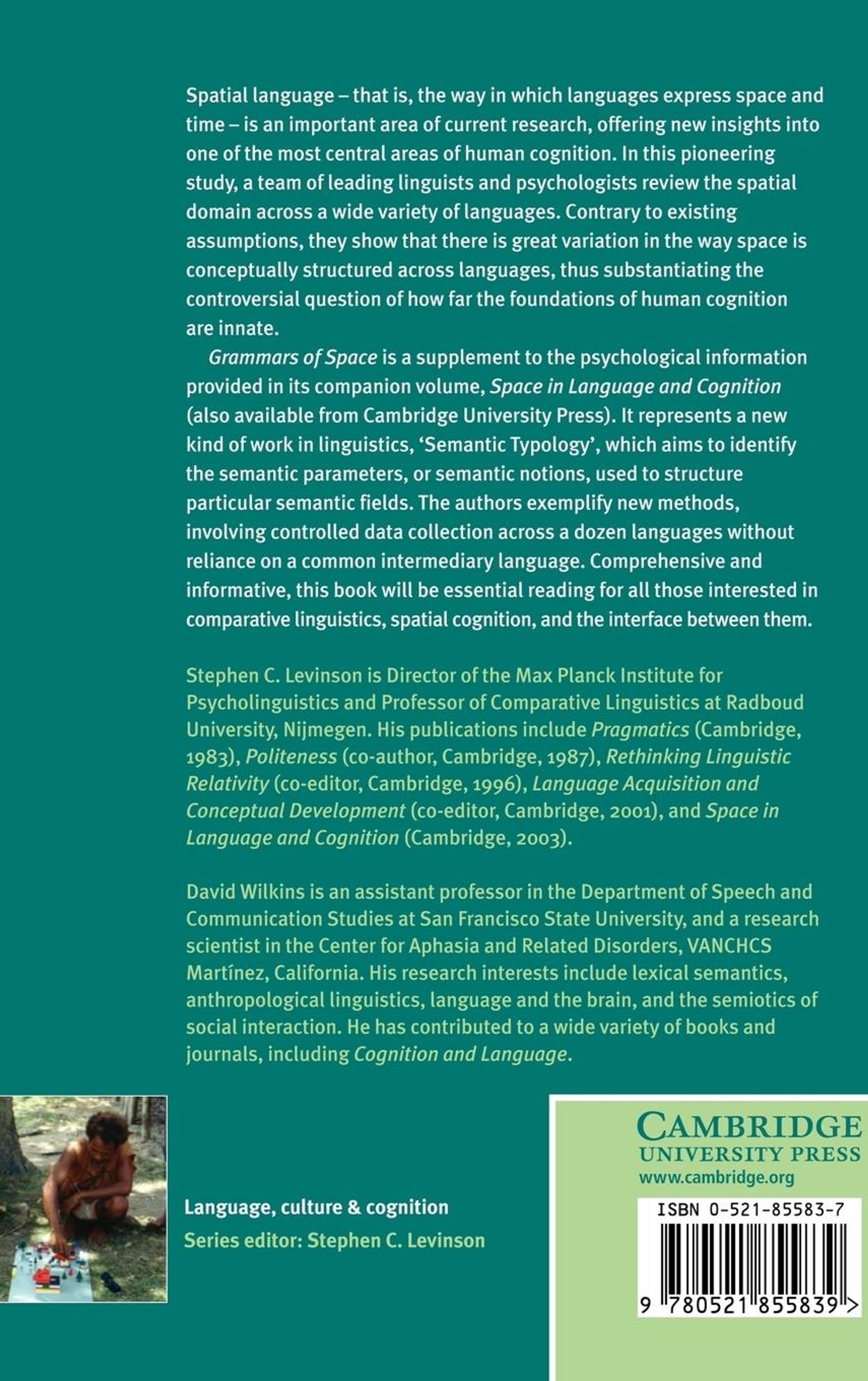 Spatial language that is, the way in which languages structure the spatial domain is an important area of current research, offering new insights into one of the most central areas of human cognition. In this pioneering collection, a team of leading linguists and psychologists review the spatial domain across a wide variety of languages. Contrary to existing assumptions, they show that there is great variation in the way space is conceptually structured across languages, thus substantiating the controversial question of how far the foundations of human cognition are innate.