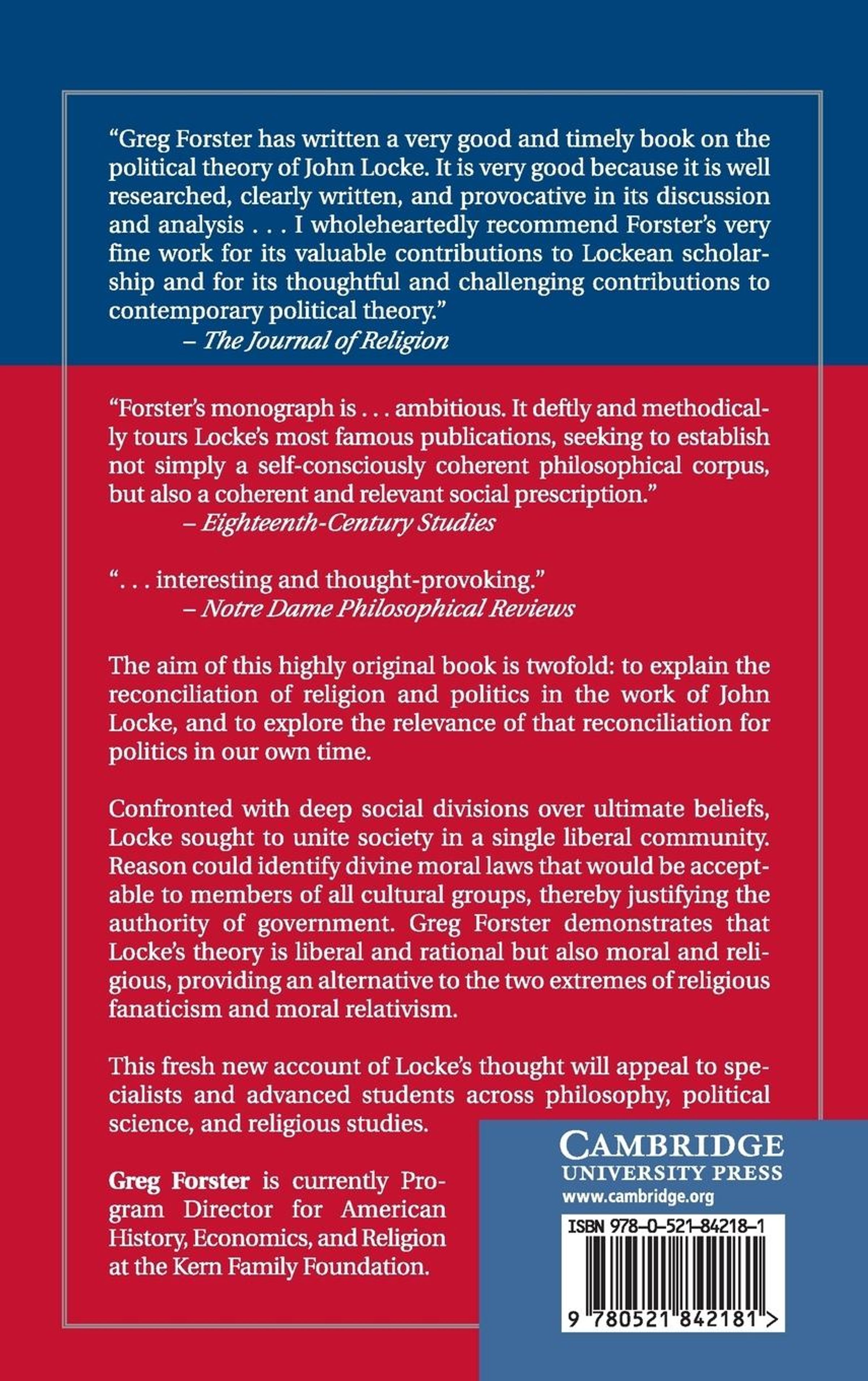 The aim of this book is twofold: to explain the reconciliation of religion and politics in the work of John Locke, and to explore the relevance of that reconciliation for politics in our own time. Confronted with deep social divisions over ultimate beliefs, Locke sought to unite society in a single liberal community. Reason could identify divine moral laws that would be acceptable to members of all cultural groups, thereby justifying the authority of government. Greg Forster demonstrates that Locke's theory is liberal and rational but also moral and religious, providing an alternative to the two extremes of religious fanaticism and moral relativism. This account of Locke's thought will appeal to specialists and advanced students across philosophy, political science and religious studies.
