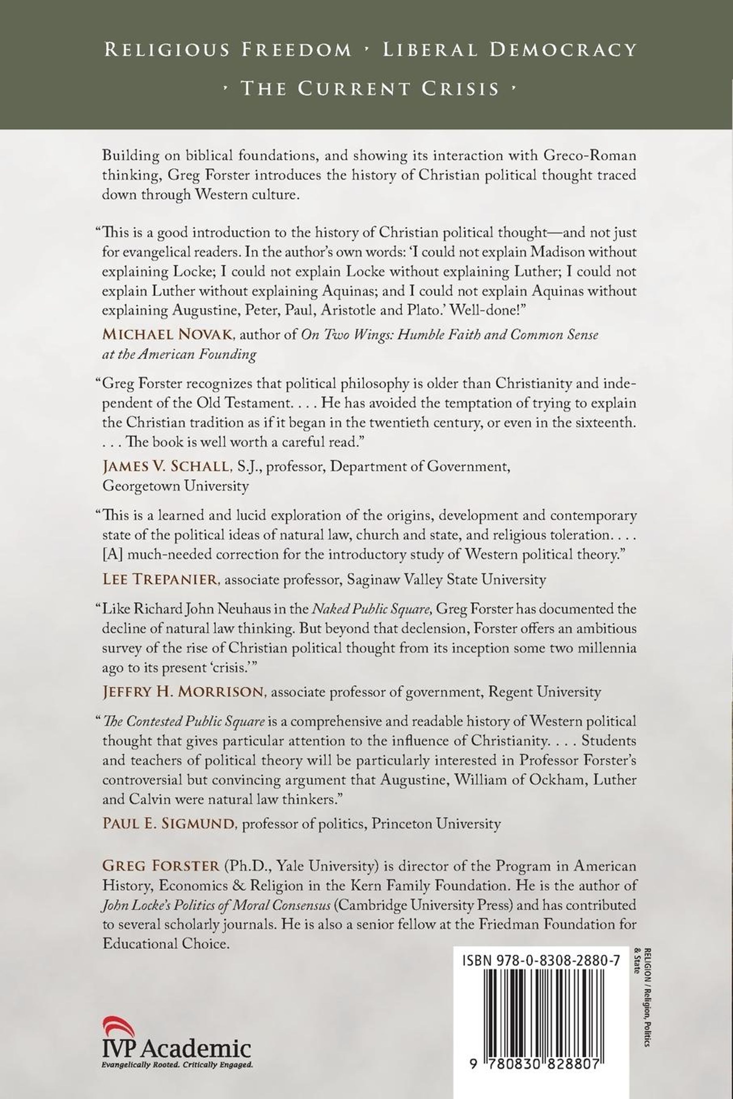 Christian thinking about involvement in human government was not born (or born again!) with the latest elections or with the founding of the Moral Majority in 1979. The history of Christian political thinking goes back to the first decades of the church's existence under persecution. Building on biblical foundations, that thinking has developed over time. This book introduces the history of Christian political thought traced out in Western culture--a culture experiencing the dissolution of a long-fought-for consensus around natural law theory. Understanding our current crisis, where there is little agreement and often opposing views about how to maintain both religious freedom and liberal democracy, requires exploring how we got where we are. Greg Forster tells that backstory with deft discernment and clear insight. He offers this retrospective not only to inform but also to point the way beyond the current impasse in the contested public square. Illuminated by sidebars on key moments in history, major figures and questions for further consideration, this book will significantly inform Christian scholars' and students' reading and interpretation of history.