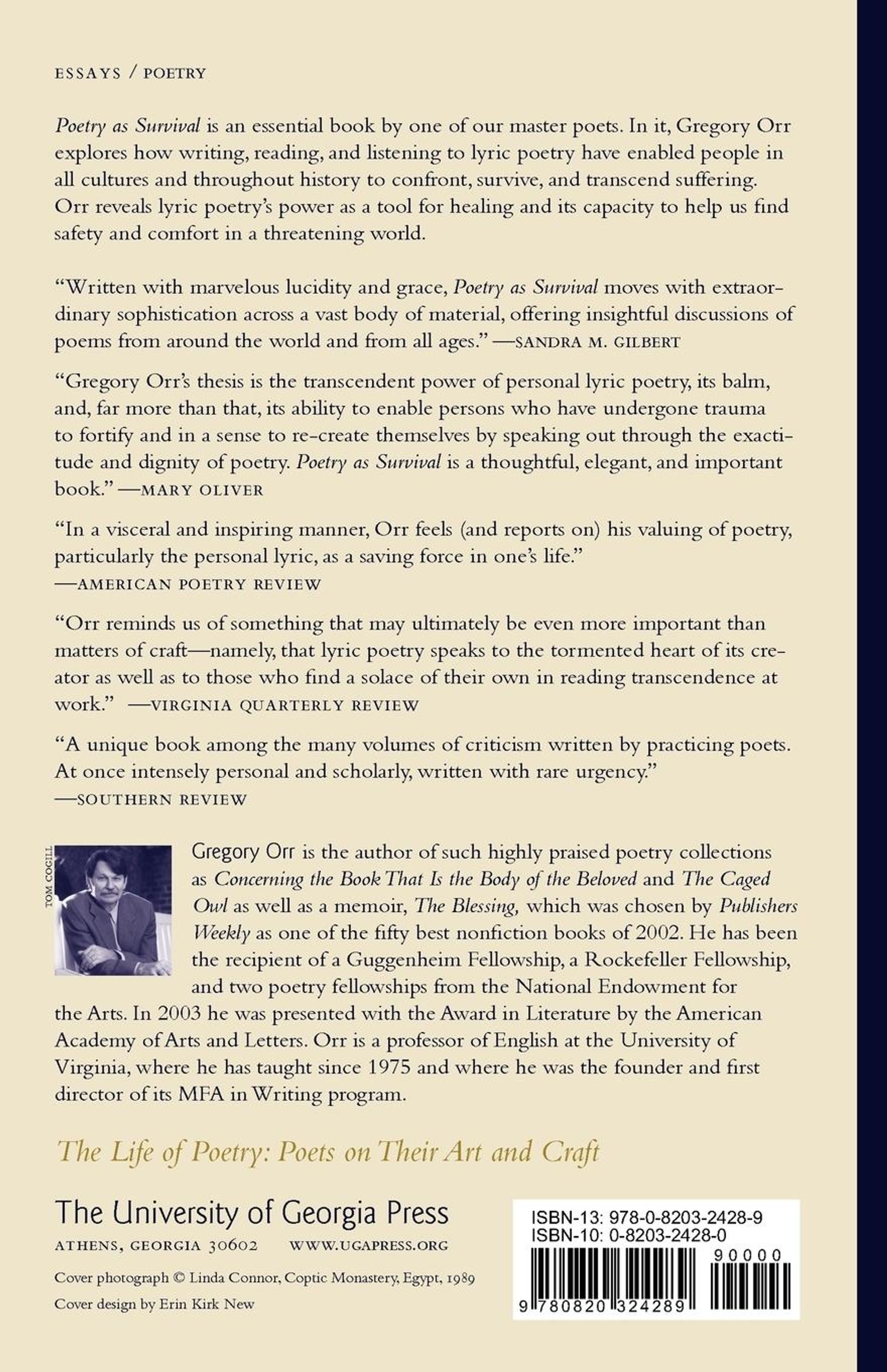 As a poet who has experienced considerable trauma -- especially as a child -- Orr refers to the damaging experiences of his past and to the role poetry played in his ability to recover and survive. His personal narrative makes all the more poignant and vivid Orr's claims for lyric poetry's power as a tool for healing. Poetry as Survival is a memorable and inspiring introduction to lyric poetry's capacity to help us find safety and comfort in a threatening world.