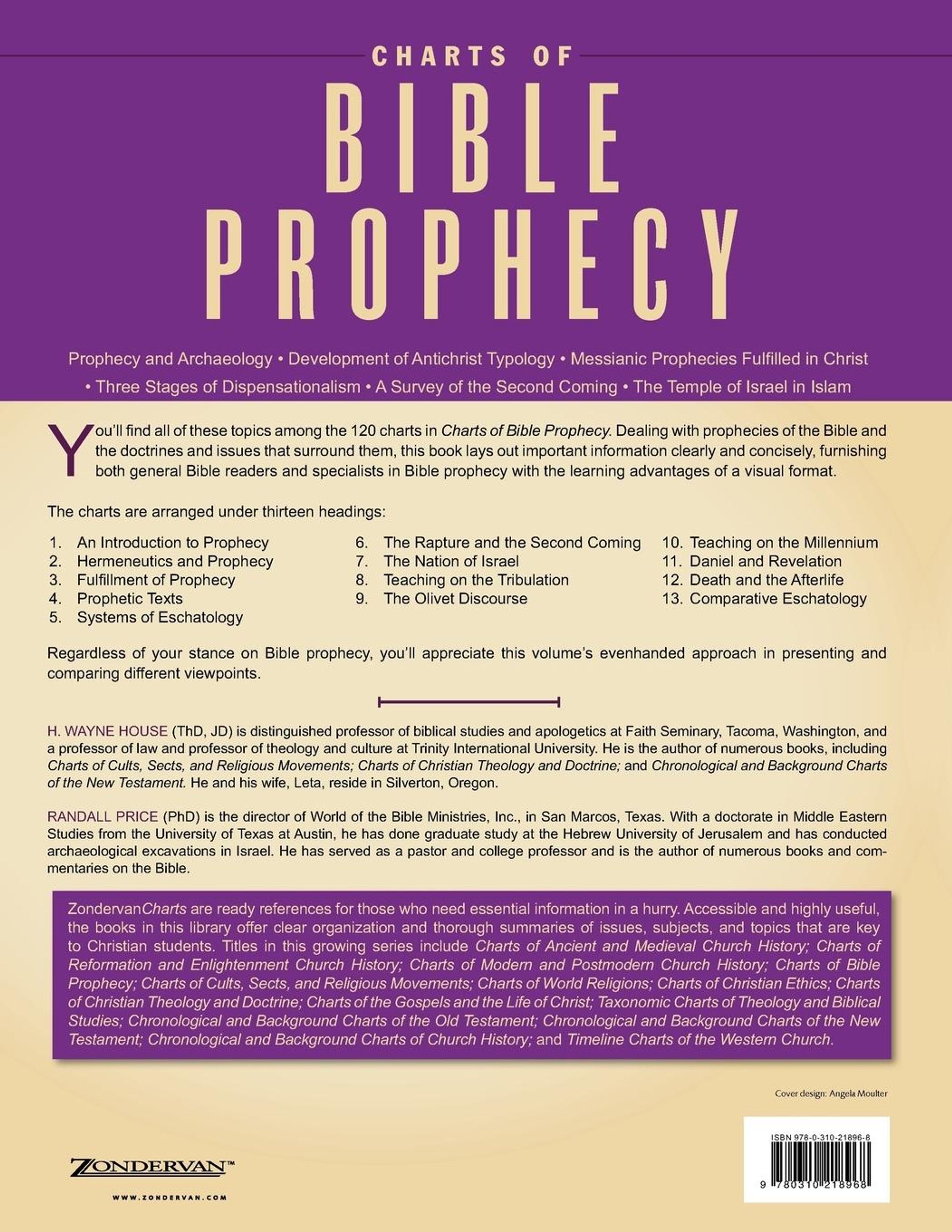A quick and easy visual guide to biblical prophecies--from the basics of interpretation to the details and fulfillment of specific prophetic texts. Packed with teaching and learning tools, from charts and timelines, to maps and visual guides, Charts of Bible Prophecy will guide you through the prophecies found throughout the Bible and the doctrines and issues that surround them. The 120 visual aids are grouped into topics such as: An Introduction to Prophecy Fulfillment of Prophecy The Rapture and the Second Coming The Nation of Israel Teaching on the Millennium Daniel and Revelation Death and the Afterlife
