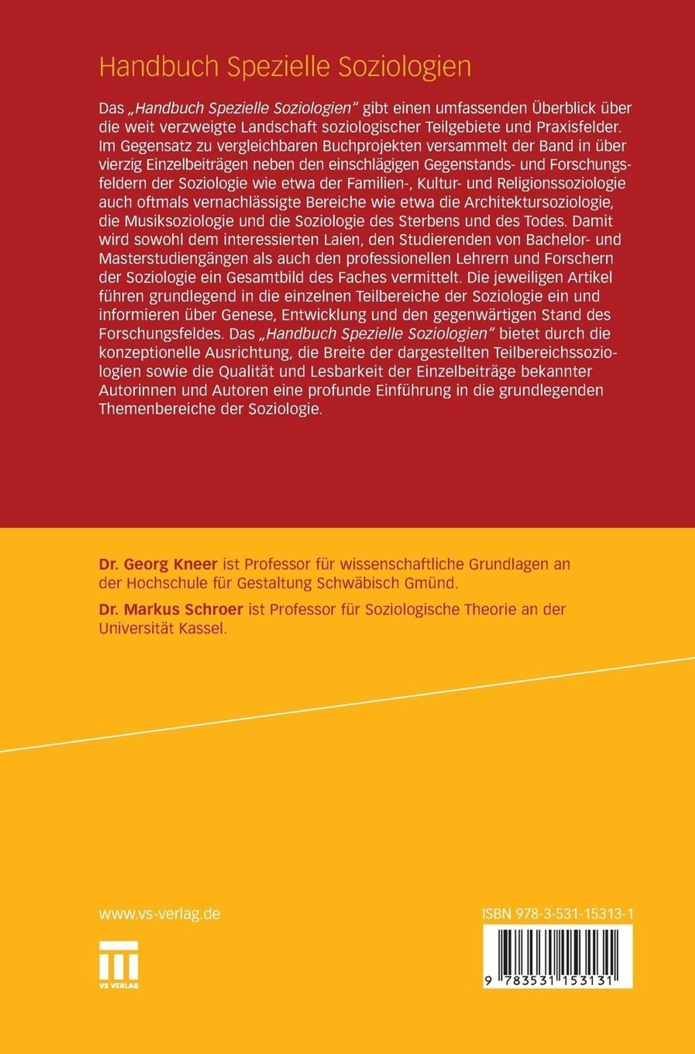 Das Handbuch Spezielle Soziologien gibt einen umfassenden Überblick über die weit verzweigte Landschaft soziologischer Teilgebiete und Praxisfelder. Im Gegensatz zu vergleichbaren Buchprojekten versammelt der Band in über vierzig Einzelbeiträgen neben den einschlägigen Gegenstands- und Forschungsfeldern der Soziologie wie etwa der Familien-, Kultur- und Religionssoziologie auch oftmals vernachlässigte Bereiche wie etwa die Architektursoziologie, die Musiksoziologie und die Soziologie des Sterbens und des Todes. Damit wird sowohl dem interessierten Laien, den Studierenden von Bachelor- und Masterstudiengängen als auch den professionellen Lehrern und Forschern der Soziologie ein Gesamtbild des Faches vermittelt. Die jeweiligen Artikel führen grundlegend in die einzelnen Teilbereiche der Soziologie ein und informieren über Genese, Entwicklung und den gegenwärtigen Stand des Forschungsfeldes.