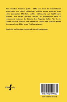 Hans Christian Andersen (1805 - 1875) war einer der berühmtesten Schriftsteller und Dichter Dänemarks. Berühmt wurde Andersen durch seine zahlreichen Märchen, welche mittlerweile zur Weltliteratur gehören. Von diesen Schriften wurden im vorliegenden Band 25 versammelt, mitunter Die Störche, Der fliegende Koffer, Fünf in der Schote und das Märchen vom Sandmann. Neben den Märchen finden sich noch diverse Bilder sowie Textillustrationen.