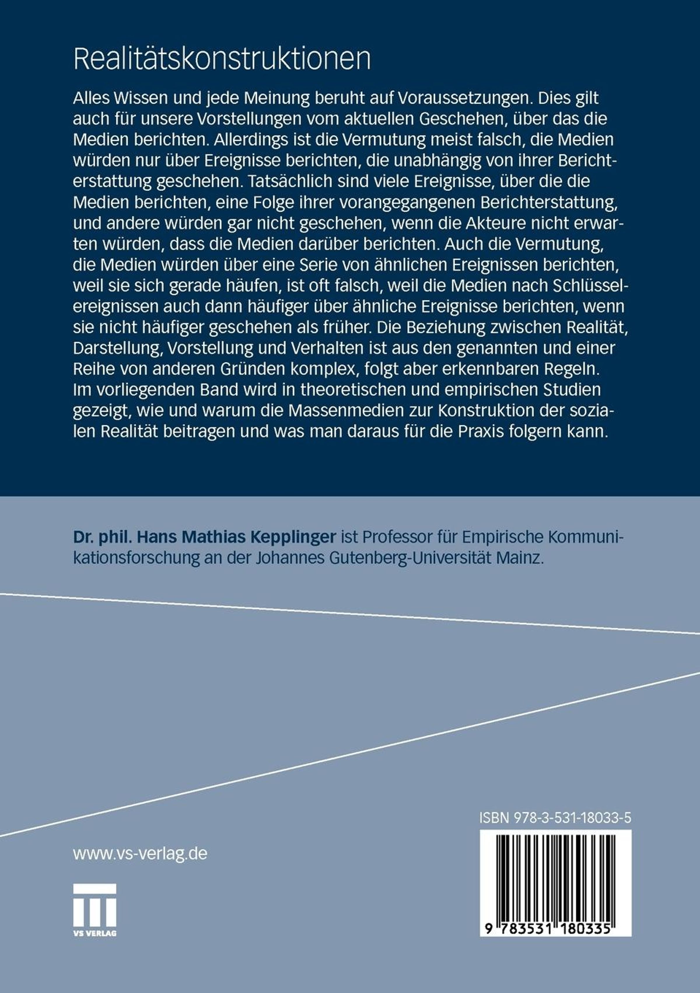 Die Medien bilden die Realität nicht ab, sondern stellen sie dar. Inwieweit folgt die Realitätsdarstellung der Medien journalistischen Berufsnormen und inwieweit spiegelt sie individuelle Vorstellungen von Journalisten? Die Realitätsdarstellungen der Medien prägen vor allem in politischen Konflikten und ökonomischen Krisen die Realitätsvorstellungen der Bevölkerung. Wie modifizieren medieninduzierte Verhaltensweisen der Bevölkerung den Verlauf solcher Konflikte und Krisen - und welche Rolle spielt dabei die Eigendynamik solcher Entscheidungssituationen? Diese Fragen werden anhand von Analysen des Einflusses der Realitätsvorstellungen der Journalisten auf die Berichterstattung sowie des Verlaufs von politischen und wirtschaftlichen Krisen beantwortet.