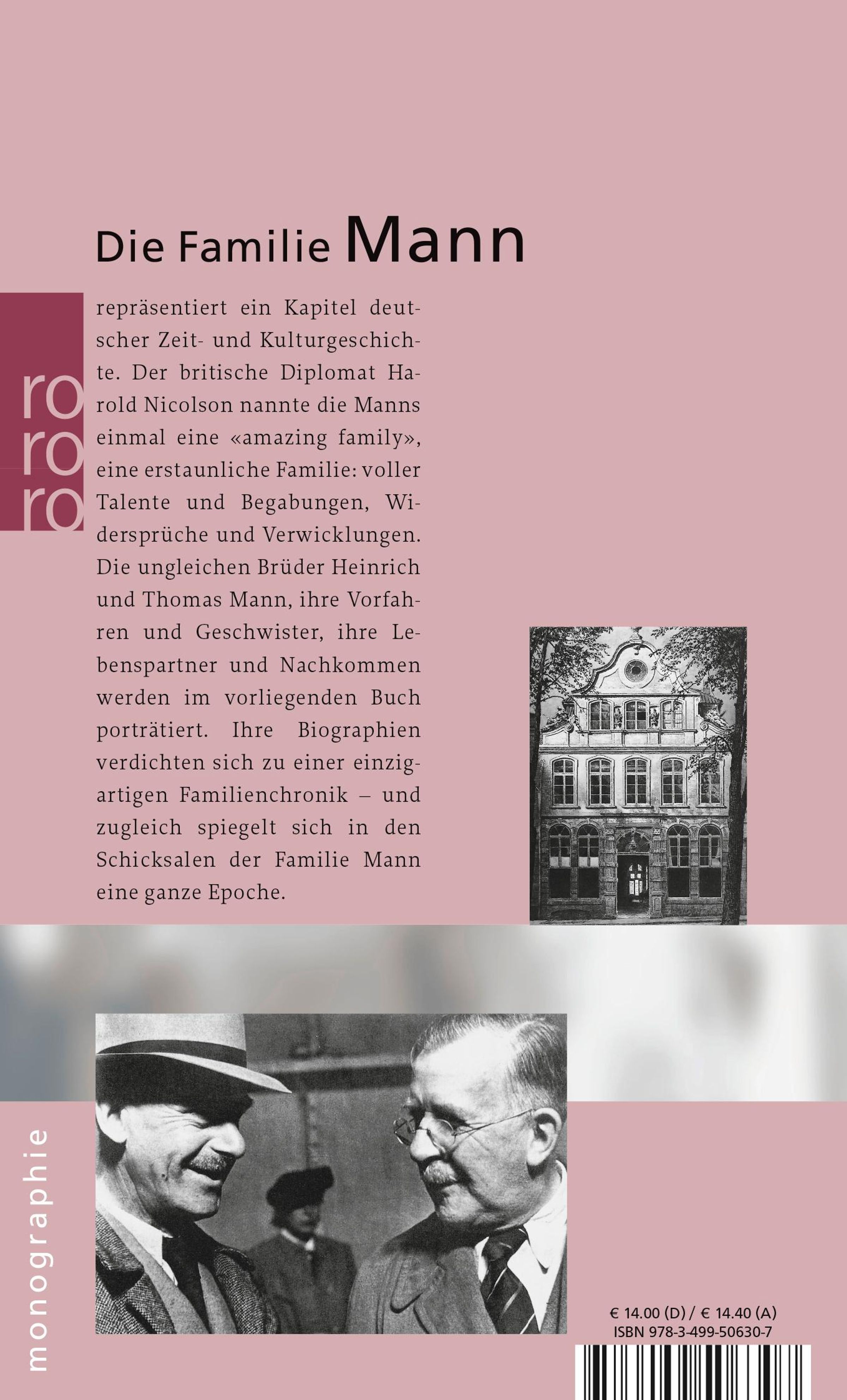 Die Familie Mann repräsentiert ein Kapitel deutscher Zeit- und Kulturgeschichte. Der britische Diplomat Harold Nicolson nannte die Manns einmal eine <<amazing family>>, eine erstaunliche Familie: voller Talente und Begabungen, Widersprüche und Verwicklungen. Die ungleichen Brüder Heinrich und Thomas Mann, ihre Vorfahren und Geschwister, ihre Lebenspartner und Nachkommen werden im vorliegenden Buch porträtiert. Ihre Biographien verdichten sich zu einer einzigartigen Familienchronik - und zugleich spiegelt sich in den Schicksalen der Familie Mann eine ganze Epoche.