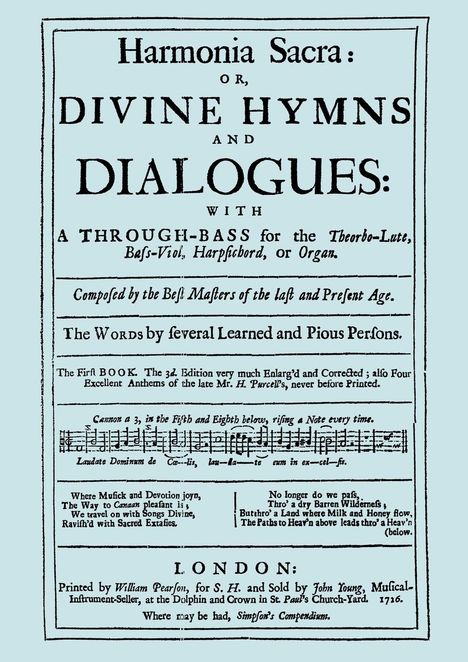 Harmonia Sacra or Divine Hymns and Dialogues. with a Through-Bass for the Theobro-Lute, Bass-Viol, Harpsichord or Organ. The First Book. [Facsimile of the 1726 edition, printed by William Pearson]