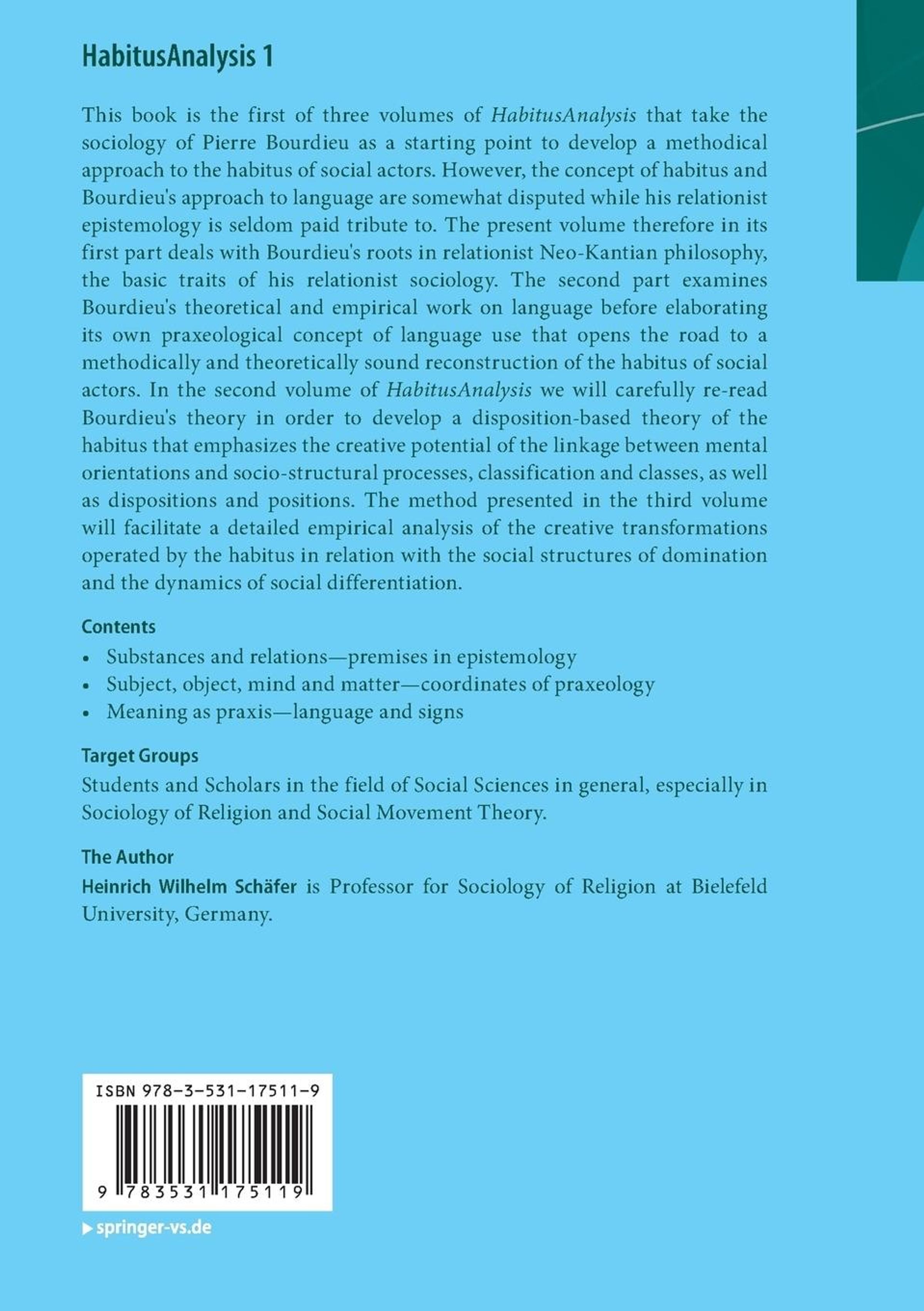 This book is the first of three volumes of HabitusAnalysis that take the sociology of Pierre Bourdieu as a starting point to develop a methodical approach to the habitus of social actors. However, the concept of habitus and Bourdieüs approach to language are somewhat disputed while his relationist epistemology is seldom paid tribute to. The present volume therefore in its first part deals with Bourdieüs roots in relationist Neo-Kantian philosophy, the basic traits of his relationist sociology. The second part examines Bourdieüs theoretical and empirical work on language before elaborating its own praxeological concept of language use that opens the road to a methodically and theoretically sound reconstruction of the habitus of social actors. In the second volume of HabitusAnalysis we will carefully re-read Bourdieüs theory in order to develop a disposition-based theory of the habitus that emphasizes the creative potential of the linkage between mental orientations and socio-structural processes, classification and classes, as well as dispositions and positions. The method presented in the third volume will facilitate a detailed empirical analysis of the creative transformations operated by the habitus in relation with the social structures of domination and the dynamics of social differentiation.