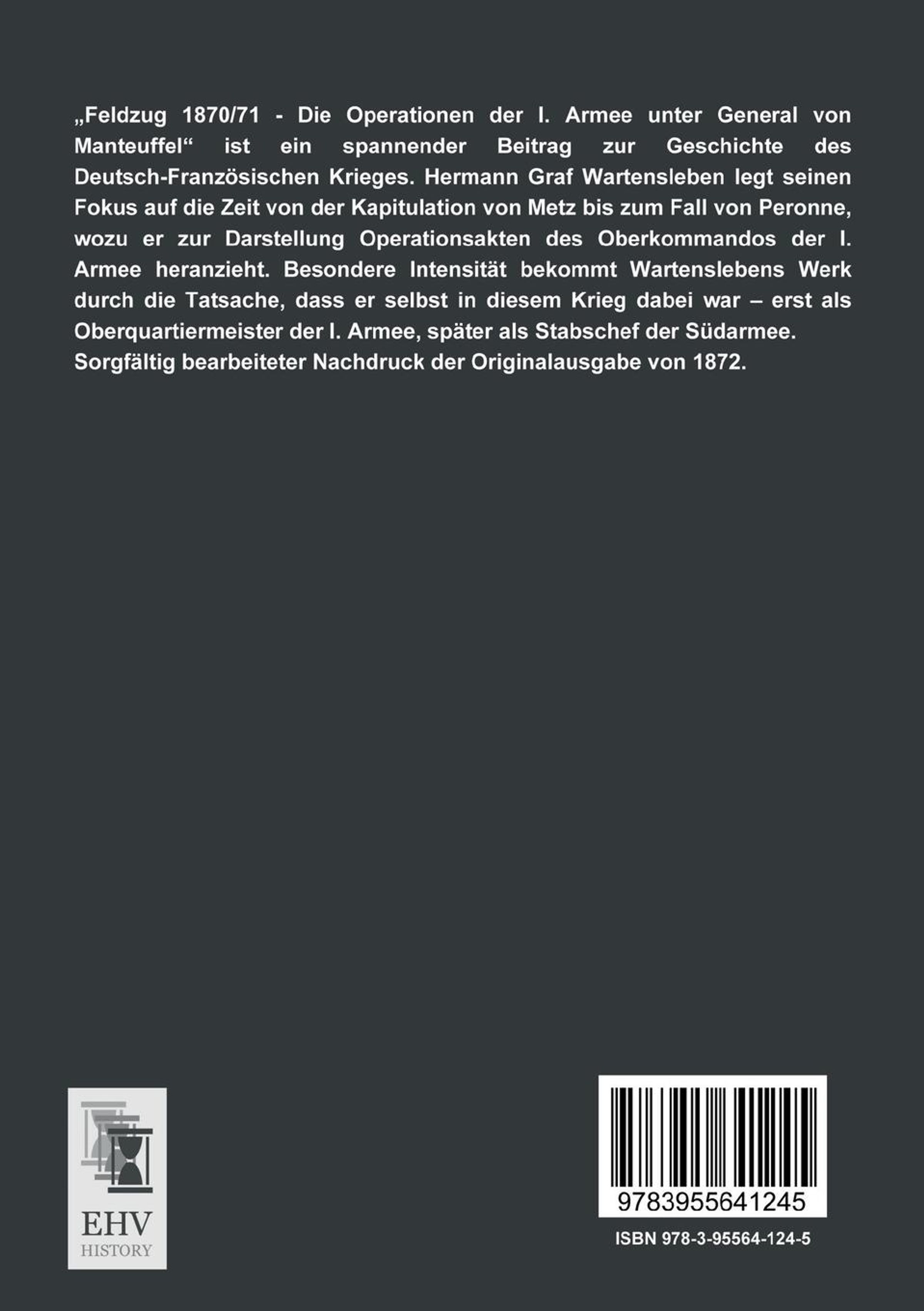 ¿Feldzug 1870 / 71 - Die Operationen der I. Armee unter General von Manteuffel¿ ist ein spannender Beitrag zur Geschichte des Deutsch-Französischen Krieges. Hermann Graf Wartensleben legt seinen Fokus auf die Zeit von der Kapitulation von Metz bis zum Fall von Peronne, wozu er zur Darstellung Operationsakten des Oberkommandos der I. Armee heranzieht. Besondere Intensität bekommt Wartenslebens Werk durch die Tatsache, dass er selbst in diesem Krieg dabei war ¿ erst als Oberquartiermeister der I. Armee, später als Stabschef der Südarmee. Sorgfältig bearbeiteter Nachdruck der Originalausgabe von 1872.