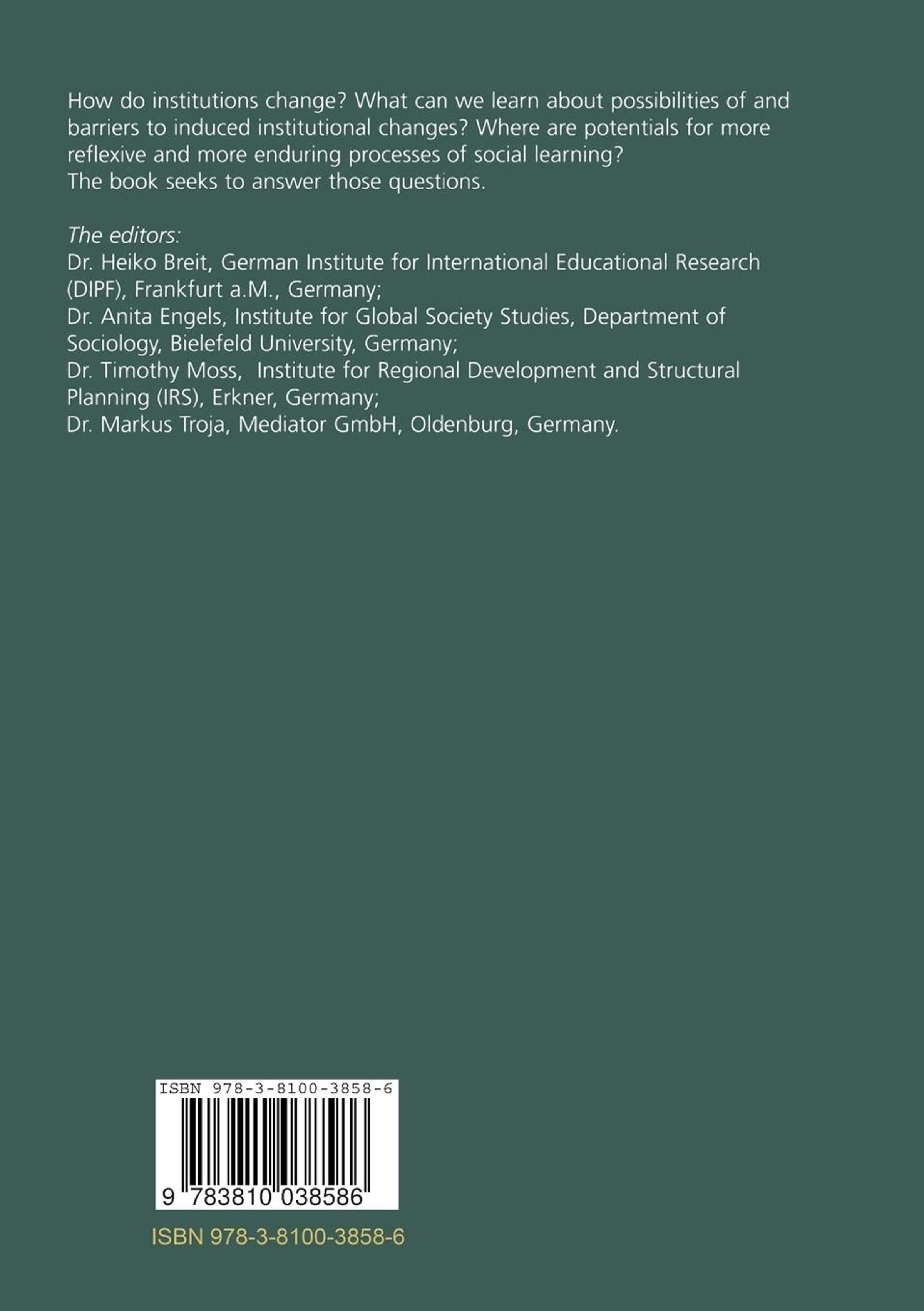 In April 1997 a group of social scientists in Germany came together to form a task force on institutional dimensions of global environmental change. At the time they were all engaged in research projects funded by the German Re search Council (DFG) within its Priority Programme "Global Environmental Change - Social and Behavioural Dimensions". Coming initially from the fields of political science and sociology they were motivated by a common interest in advancing knowledge on processes of institutional change relevant to major environmental problems. By exploring the capacity of diverse disci plinary approaches to explain institutional change and by exchanging knowl edge on environmental institutions in various social, cultural and political settings they aimed to shed fresh light on the complex dynamics of institu tions. By 1999 the task force had grown in numbers and scope to include geographers, cultural anthropologists and cultural psychologists, reflecting a unique and broad spectrum of social science research into institutions and the environment. The new members brought not only new disciplinary perspec tives to the group, but also an interest in a wider range of institutions func tioning at different societal levels and in new cultural settings, including de veloping countries. This book is the principal product of the task force.