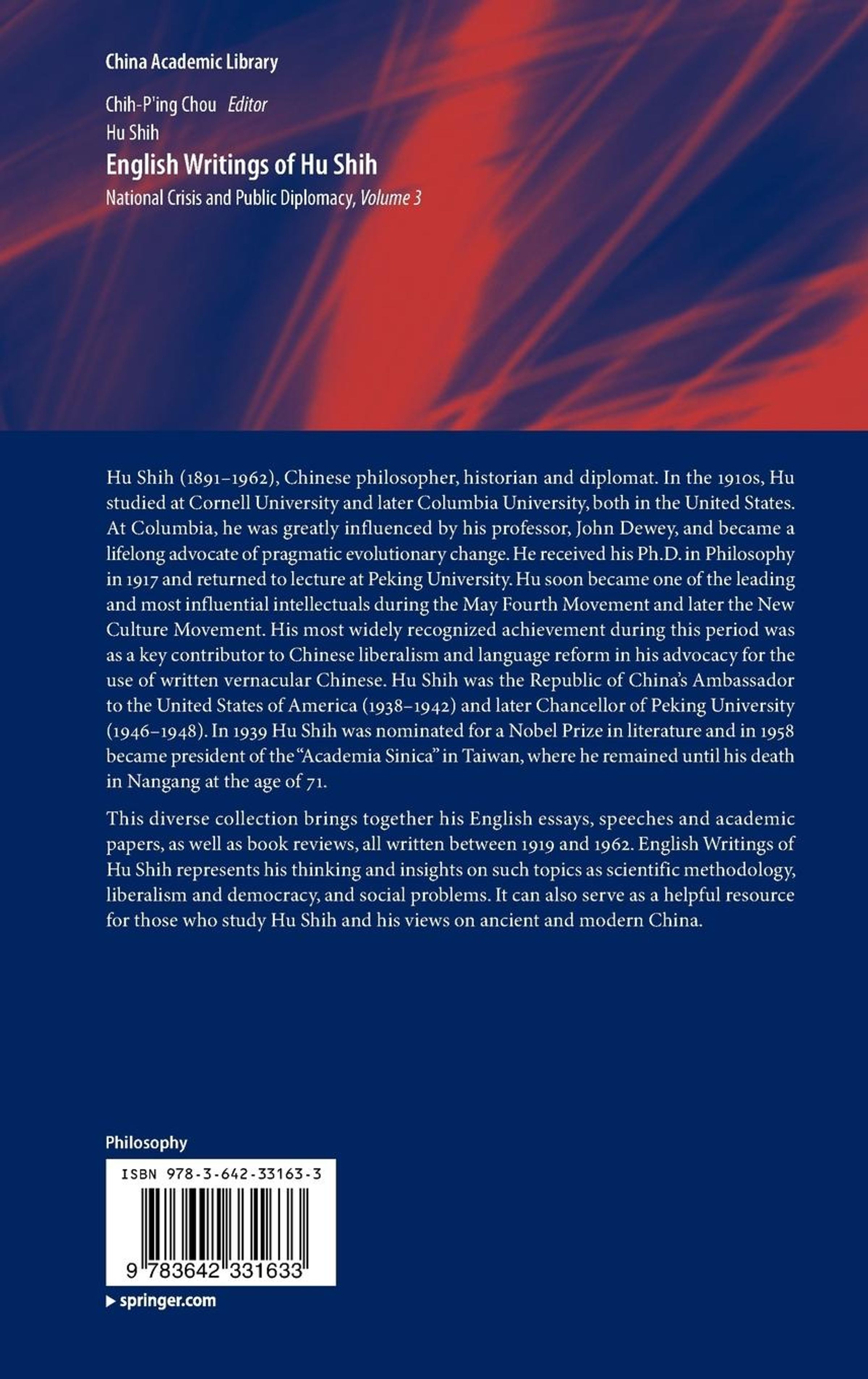 Hu Shih (1891- 1962), Chinese philosopher, historian and diplomat, is widely recognized as a key contributor to Chinese language reform, intellectual researches and public diplomacy. This collection of diverse content brings together his English essays, speeches, academic papers as well as book reviews from 1919 to 1962. English Writings of Hu Shih represents Hu Shih's thinking and insights on such topics of scientific methodology, liberalism and democracy, and social problems. It could also serve as a helpful resource for those who study Hu Shih and the ancient and modern China in his view.