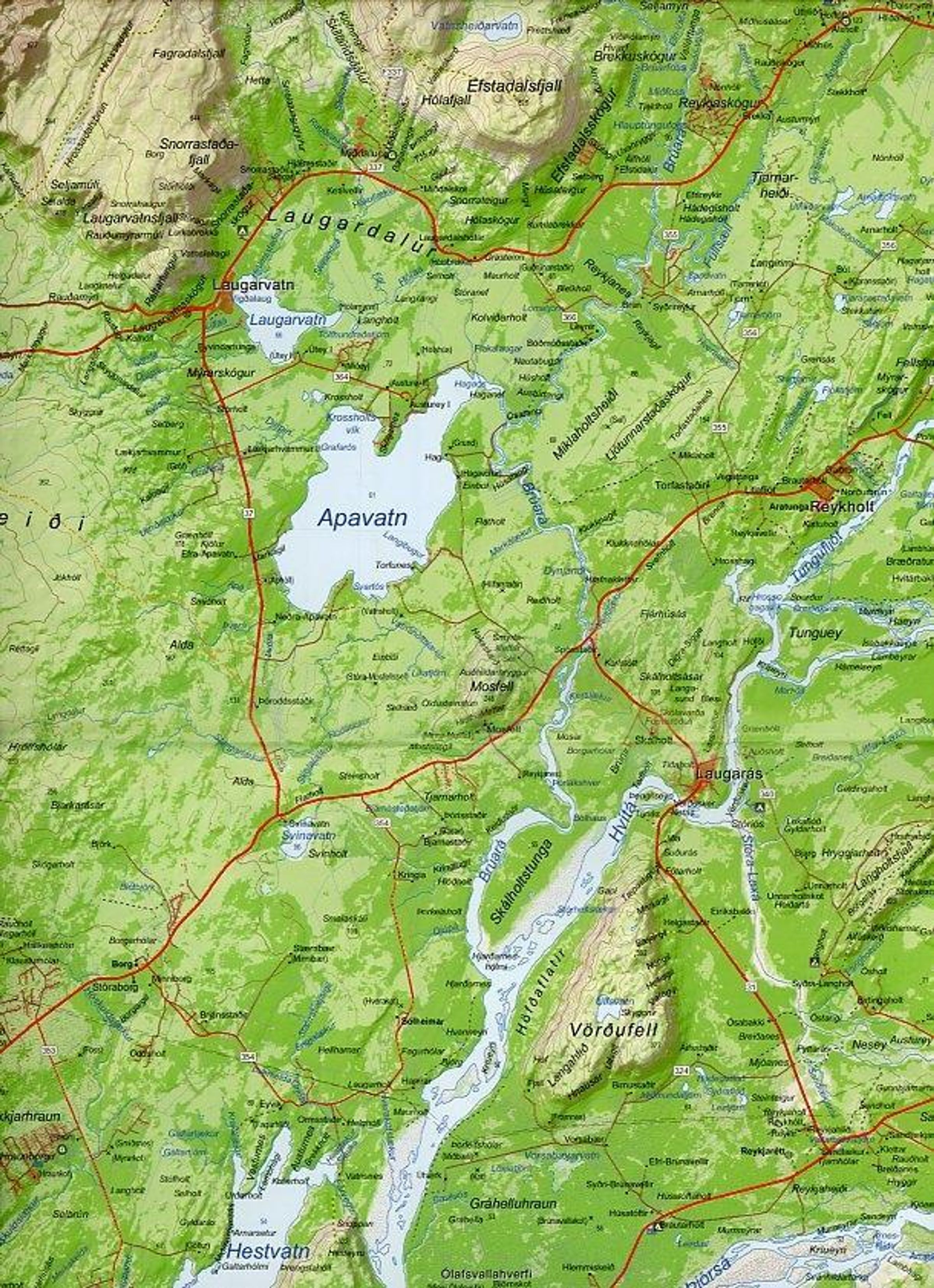 Asphaltierte Straßen, Schotterstraßen, Pisten, Furte, Straßennummern, Wanderwege, Reitwege, Tunnel, Fähren, Schutzhütten, Nothütten, Wasserkraftwerke, Geothermalkraftwerke, Stromleitungen, Leuchttürme, Flugplätze, Schafscheideplätze.