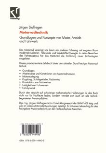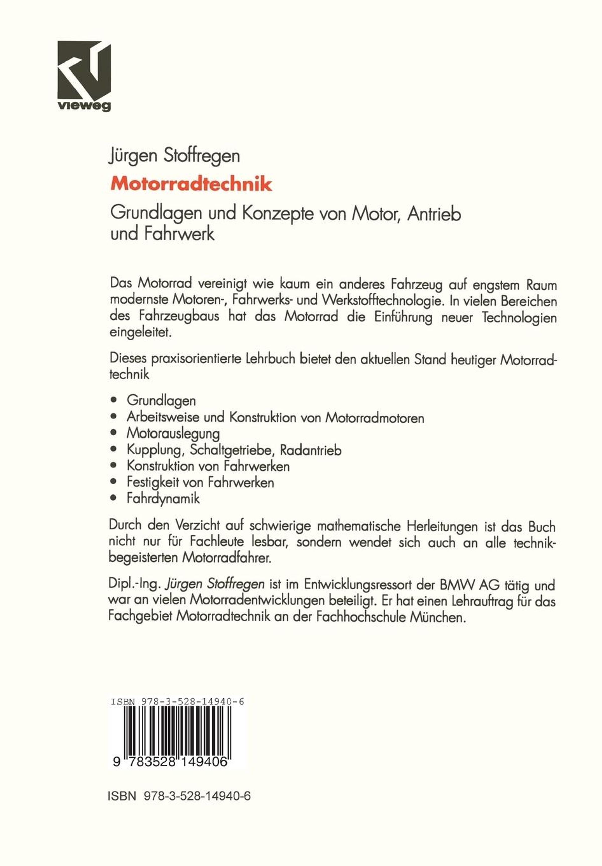 Gesamtfahrzeug.- 1 Einführung.- 2 Fahrwiderstände, Leistungsbedarf und Fahrleistungen.- Motor und Antrieb.- 3 Arbeitweise, Bauformen und konstruktive Ausführung von Motorradmotoren.- 4 Motorleistungsabstimmung im Versuch.- 5 Kupplung, Schaltgetriebe und Radantrieb.- Fahrwerk.- 6 Konstruktive Auslegung von Motorradfahrwerken.- 7 Festigkeits- und Steifigkeitsuntersuchungen an Motorradfahrwerken.- 8 Fahrdynamik und Fahrversuch.- 9 Bremsen.- 10 Aerodynamik und Fahrerplatzgestaltung.- 11 Ausblick auf mögliche Zukunftsentwicklungen.- Anhang - Glossar physikalischer Grundbegriffe.- Sachwortverzeichnis.
