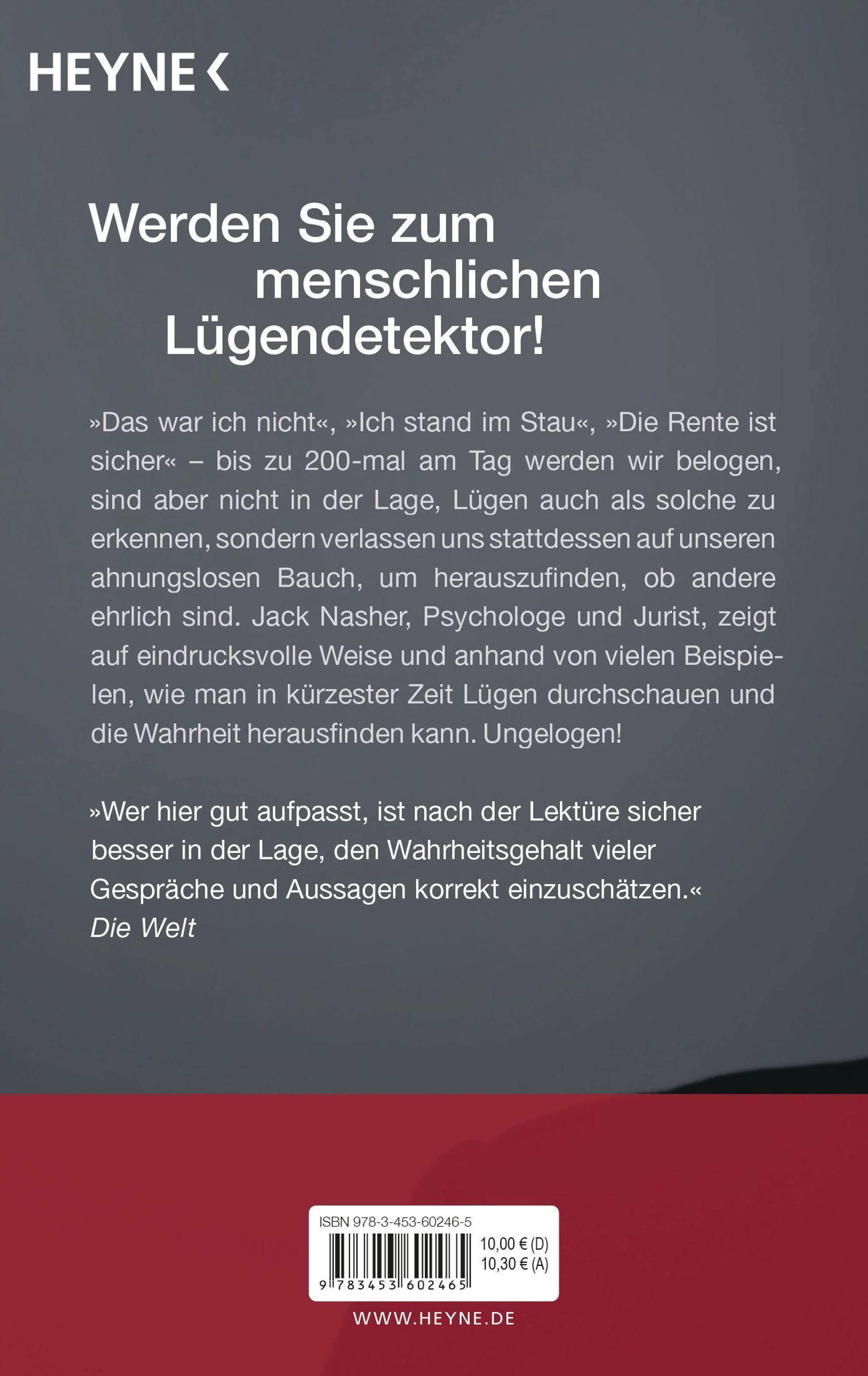 >>Das war ich nicht<<, >>Ich stand im Stau<<, >>Die Rente ist sicher<< - bis zu 200-mal am Tag werden wir belogen, sind aber nicht in der Lage, Lügen auch als solche zu erkennen, sondern verlassen uns stattdessen auf unseren ahnungslosen Bauch, um herauszufinden, ob andere ehrlich sind. Jack Nasher, Psychologe und Jurist, zeigt auf eindrucksvolle Weise und anhand von vielen Beispielen, wie man in kürzester Zeit Lügen durchschauen und die Wahrheit herausfinden kann. Ungelogen!
