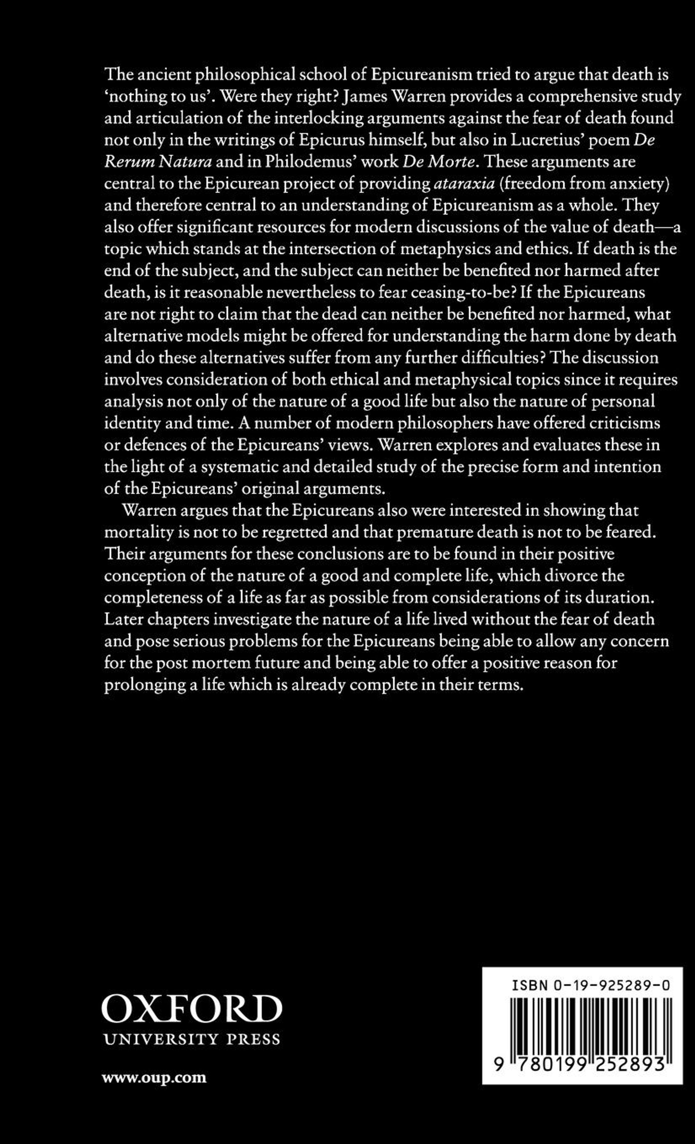 The ancient philosophical school of Epicureanism tried to argue that death is "nothing to us." Were they right? James Warren provides a comprehensive study and articulation of the interlocking arguments against the fear of death found not only in the writings of Epicurus himself, but also in