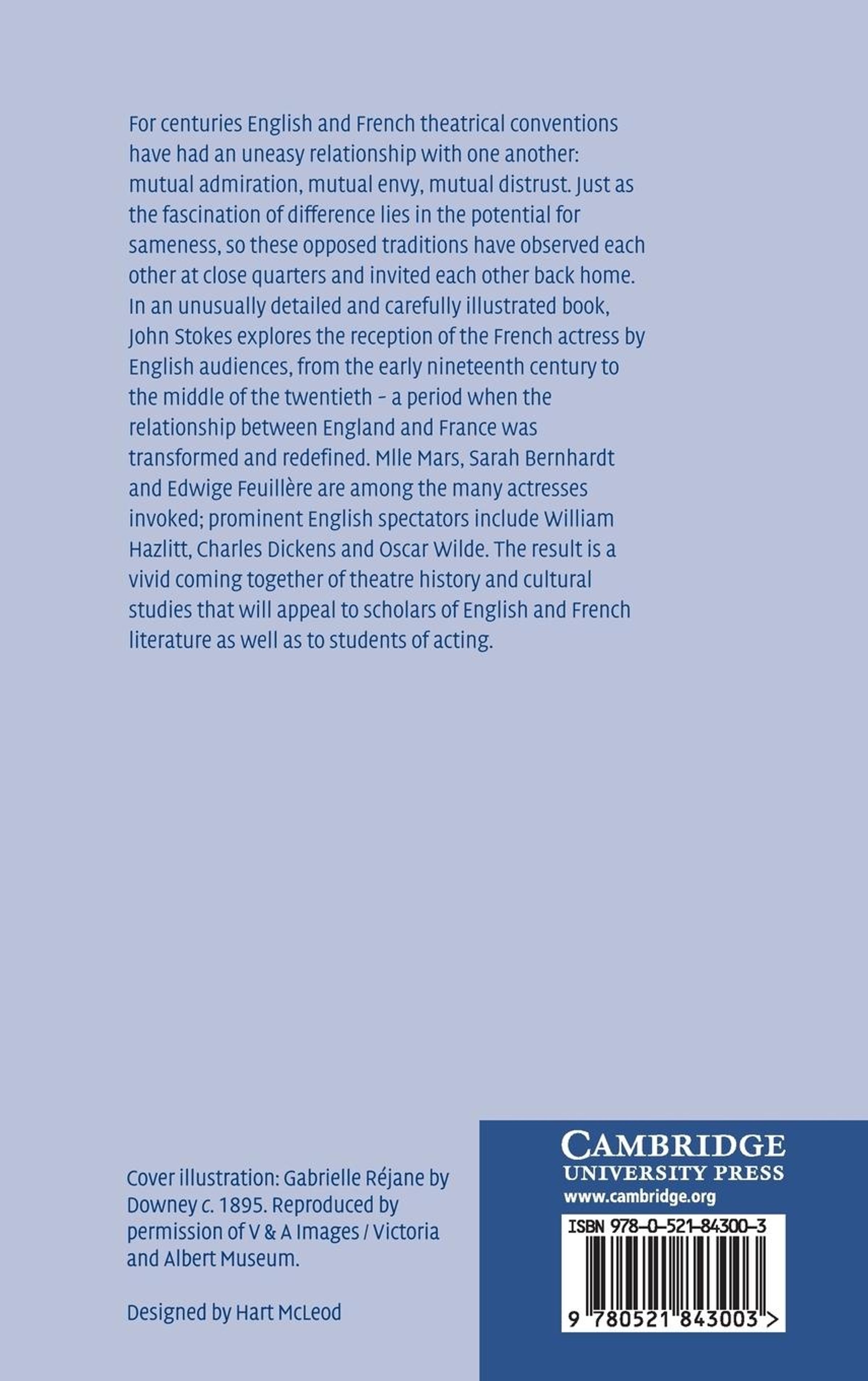For centuries English and French theatrical traditions have had an uneasy relationship with one another: mutual admiration, mutual envy, mutual distrust. Just as the fascination of difference lies in the potential for sameness, so these opposed traditions have observed each other at close quarters and invited each other back home. In this unusually detailed and carefully illustrated book, John Stokes explores the reception of the French actress by the English audiences, from the early nineteenth century to the middle of the twentieth - a period when the relationship between England and France was transformed and redefined. Mlle Mars, Sarah Bernhardt and Edwige Feuillere are among the many actresses invoked; prominent English spectators include William Hazlitt, Charles Dickens, and Oscar Wilde. The result is a vivid coming together of theatre history and cultural studies, and will appeal to scholars of English and French literature as well as students of acting.
