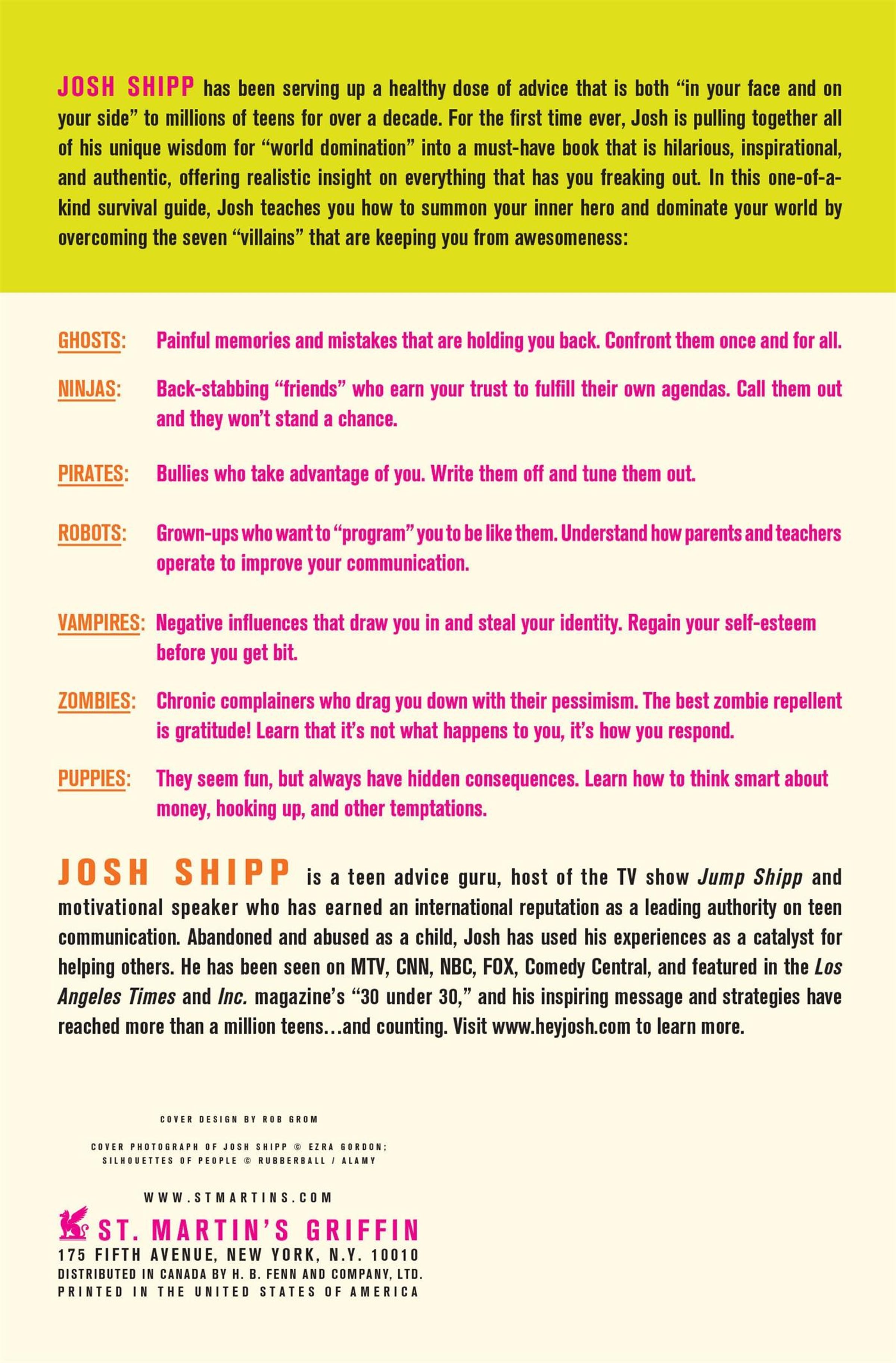 Josh Shipp has been serving up a healthy dose of "advice with an attitude" to millions of teens for over a decade, in front of packed auditoriums across the country. For the first time ever, Josh is pulling together all of his unique advice for "world domination" into a must-have survival guide. Hilarious, inspirational, and authentic, Josh offers golden nuggets of wisdom for everything that has you freaking out (pretty much all the stuff you can't fathom addressing with Mom and Dad). So, summon your inner hero and learn to dominate the seven "villains" that are keeping you from awesomeness.