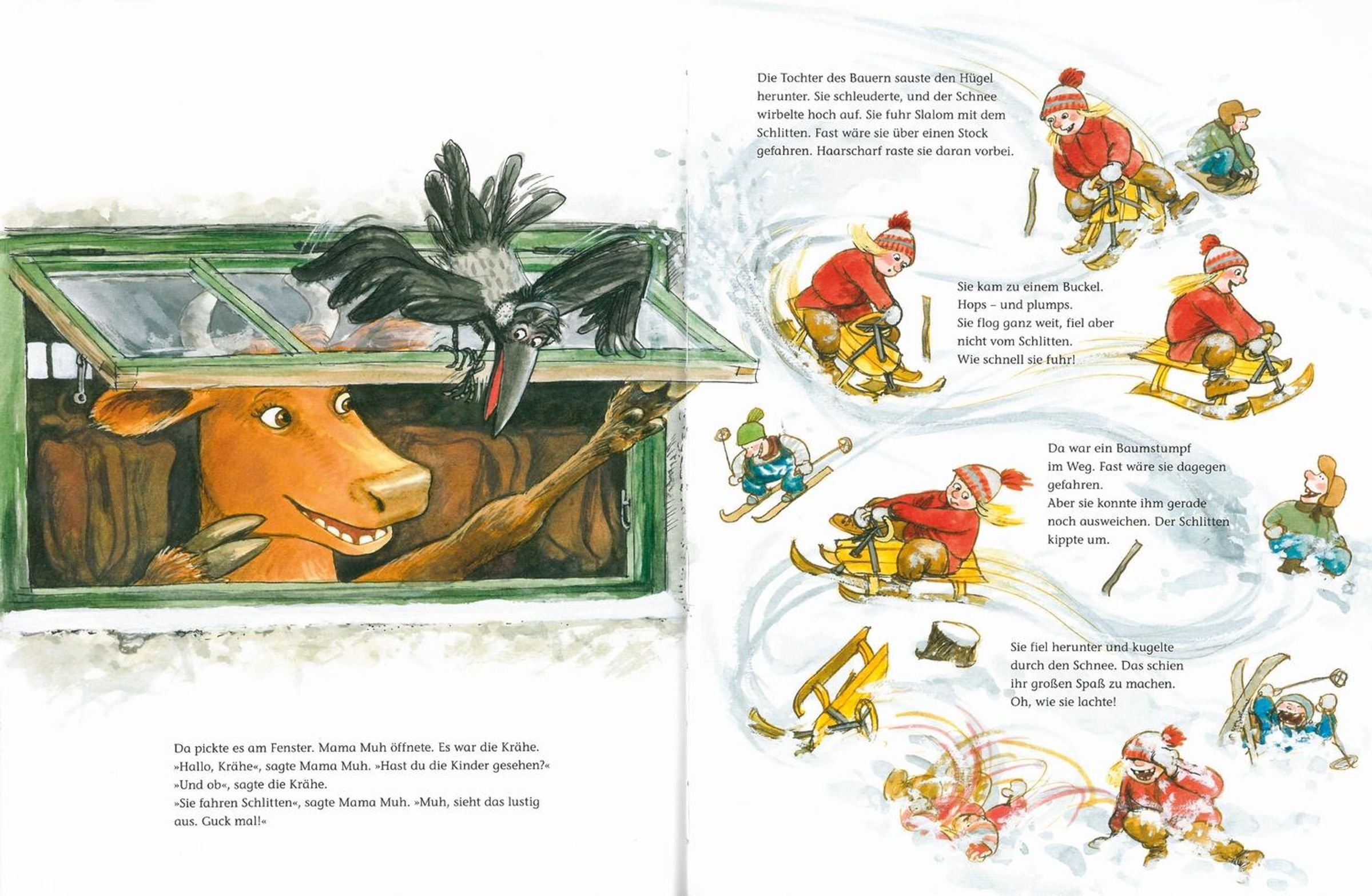 In "Mama Muh fährt Schlitten" wagt sich die unerschrockene Kuh Mama Muh in ein neues Abenteuer und zeigt, dass Kühe weit mehr können, als nur im Stall zu stehen - sogar Schlittenfahren. Dieses Mal stürzt sie sich, mit Unterstützung ihrer besten Freundin, der schlauen Krähe, in das winterliche Vergnügen. Doch der Spaß nimmt eine unerwartete Wendung, als plötzlich Slalomstöcke im Weg sind. Die humorvollen Dialoge zwischen Mama Muh und der Krähe, gepaart mit ihren kreativen und manchmal chaotischen Ideen, machen die Geschichte zu einem unterhaltsamen Leseerlebnis für Kinder. Die lebhaften Illustrationen fangen die Dynamik und den Spaß der Charaktere ein, was das Vorlesen oder Anschauen zu einem Genuss für Kinder und Eltern gleichermaßen macht. Mama Muh beweist einmal mehr, dass es nie zu spät ist, etwas Neues zu probieren, und dass wahre Freundschaft dabei hilft, jedes Hindernis zu überwinden.