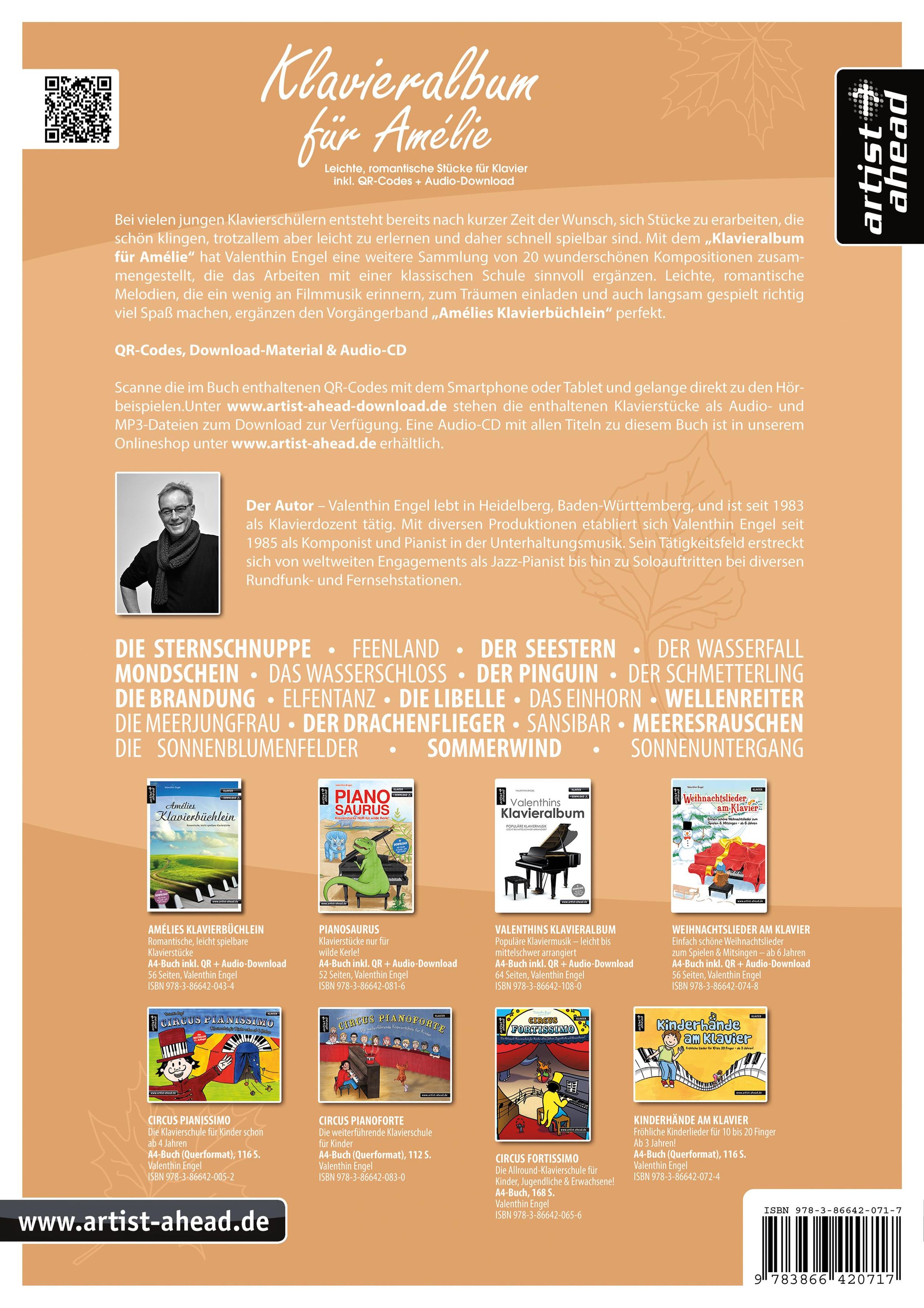 Bei vielen jungen Klavierschülern entsteht bereits nach kurzer Zeit der Wunsch, sich Stücke zu erarbeiten, die schön klingen, trotzallem aber leicht zu erlernen und daher schnell spielbar sind. Mit dem "Klavieralbum für Amélie" hat Erfolgsautor Valenthin Engel eine weitere Sammlung von 20 wunderschönen Kompositionen zusammengestellt, die das Arbeiten mit einer klassischen Schule sinnvoll ergänzen. Leichte, romantische Melodien, die ein wenig an Filmmusik und Ludovico Einaudi, Yann Tiersen, Philip Glass oder Yiruma erinnern, zum Träumen einladen und auch langsam gespielt richtig viel Spaß machen, ergänzen den Vorgängerband "Amélies Klavierbüchlein" perfekt!