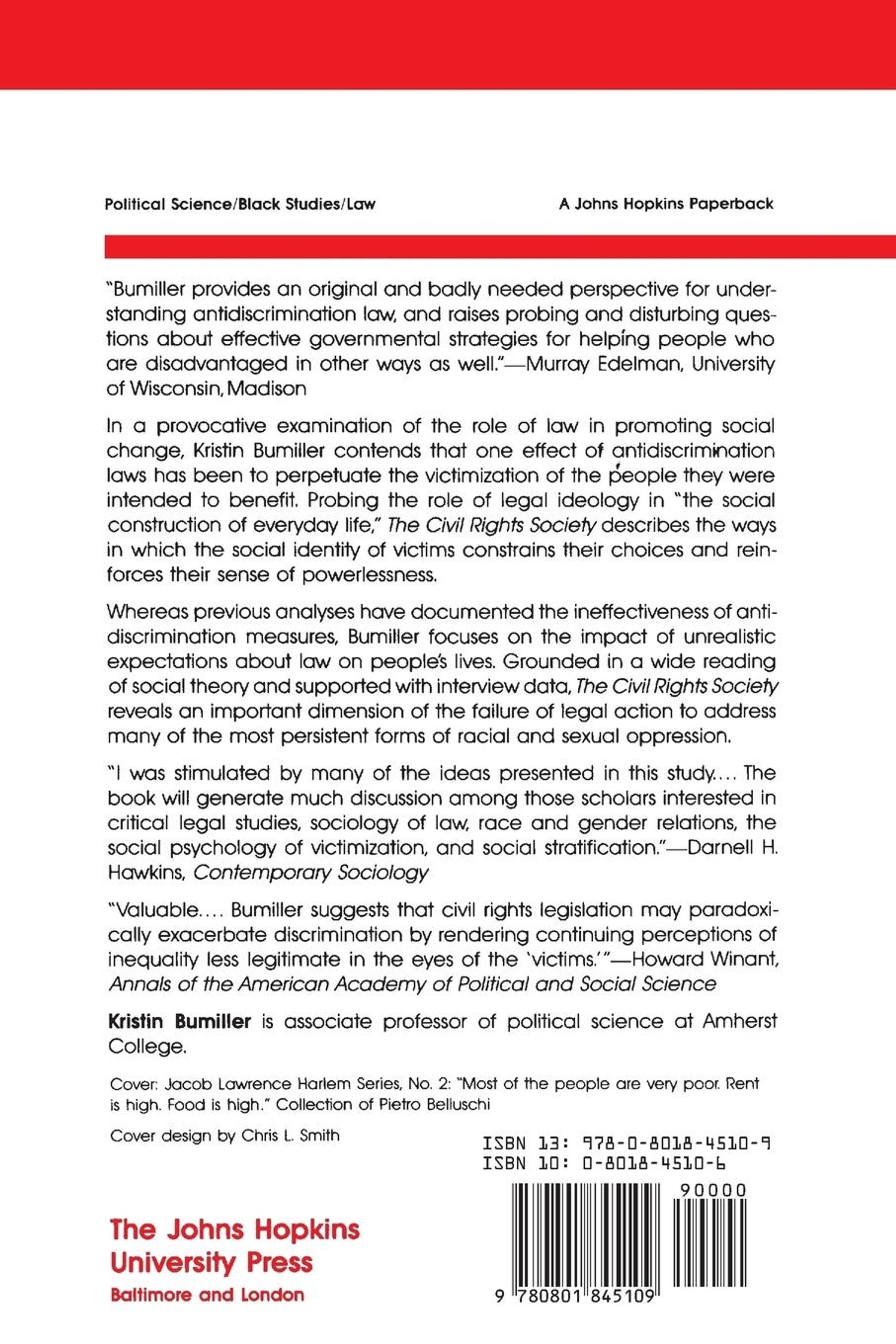 "Bumiller is among several scholars who have questioned the excessive reliance on law, especially constitutional law and the Supreme Court, as a means of solving social problems in the United States. The book will generate much discussion among those scholars interested in critical legal studies, sociology of law, race and gender relations, the social psychology of victimization, and social stratification." -- Darnell F. Hawkins, Contemporary Sociology.