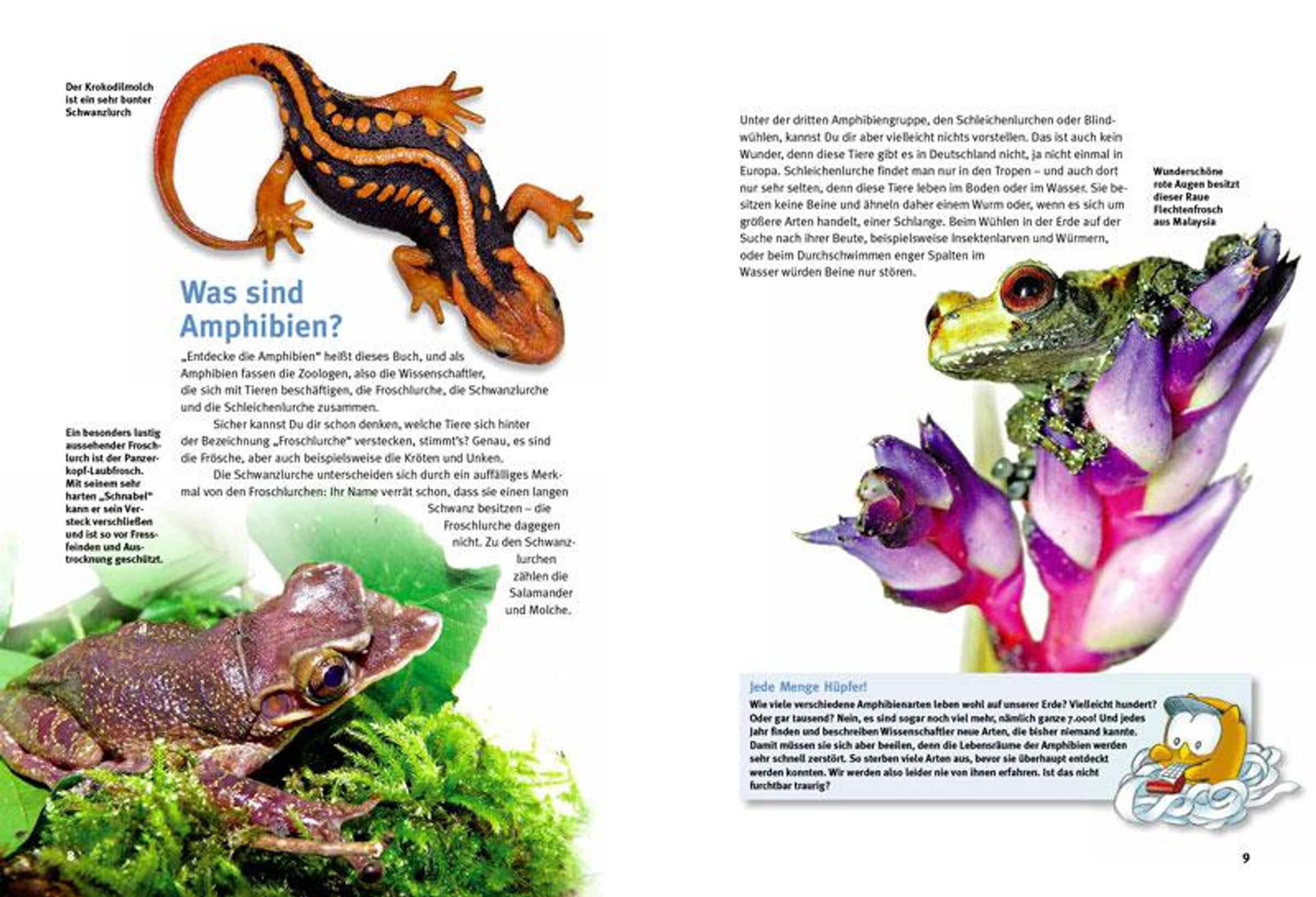 Einen Frosch, der in seinem Teich herumschwimmt und munter quakt, oder den schwarz-gelben Feuersalamander kennt jedes Kind. Aber wie leben diese sympathischen Tiere? Was fressen sie, wie überstehen sie den Winter? Wie wird aus einer Kaulquappe ein kleiner Frosch? Und welche anderen erstaunlichen Amphibien gibt es?