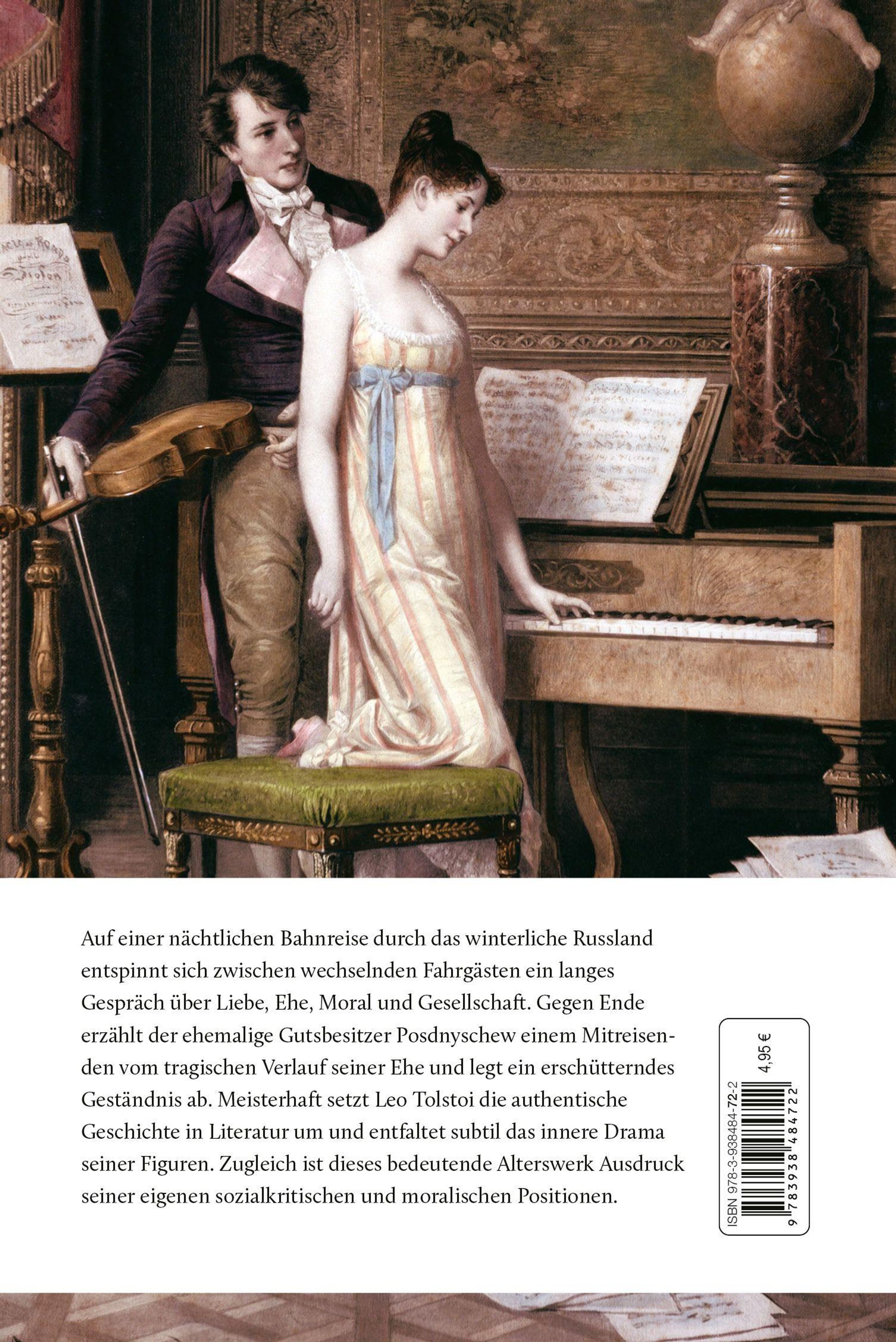 Auf einer nächtlichen Bahnreise durch das winterliche Russland entspinnt sich zwischen wechselnden Fahrgästen ein langes Gespräch über Liebe, Ehe, Moral und Gesellschaft. Gegen Ende erzählt der ehemalige Gutsbesitzer Posdnyschew einem Mitreisenden vom tragischen Verlauf seiner Ehe und legt ein erschütterndes Geständnis ab. Meisterhaft setzt Leo Tolstoi die authentische Geschichte in Literatur um und entfaltet subtil das innere Drama seiner Figuren. Zugleich ist dieses bedeutende Alterswerk Ausdruck der eigenen sozialkritischen und moralischen Positionen.