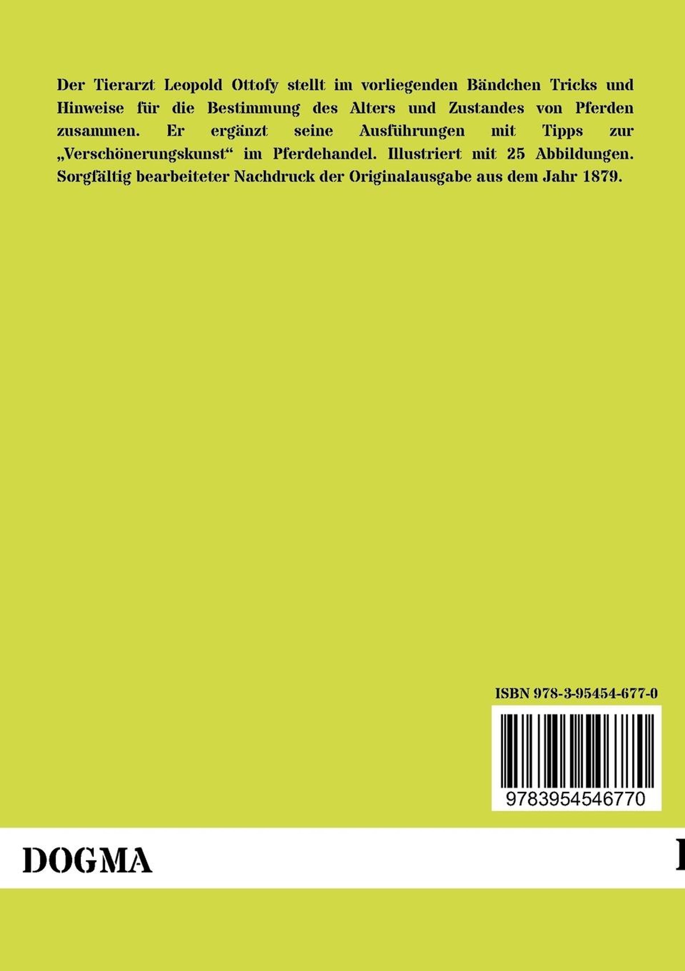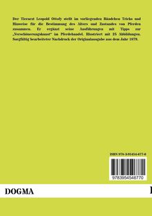Der Tierarzt Leopold Ottofy stellt im vorliegenden Bändchen Tricks und Hinweise für die Bestimmung des Alters und Zustandes von Pferden zusammen. Er ergänzt seine Ausführungen mit Tipps zur ¿Verschönerungskunst¿ im Pferdehandel. Illustriert mit 25 Abbildungen. Sorgfältig bearbeiteter Nachdruck der Originalausgabe aus dem Jahr 1879.