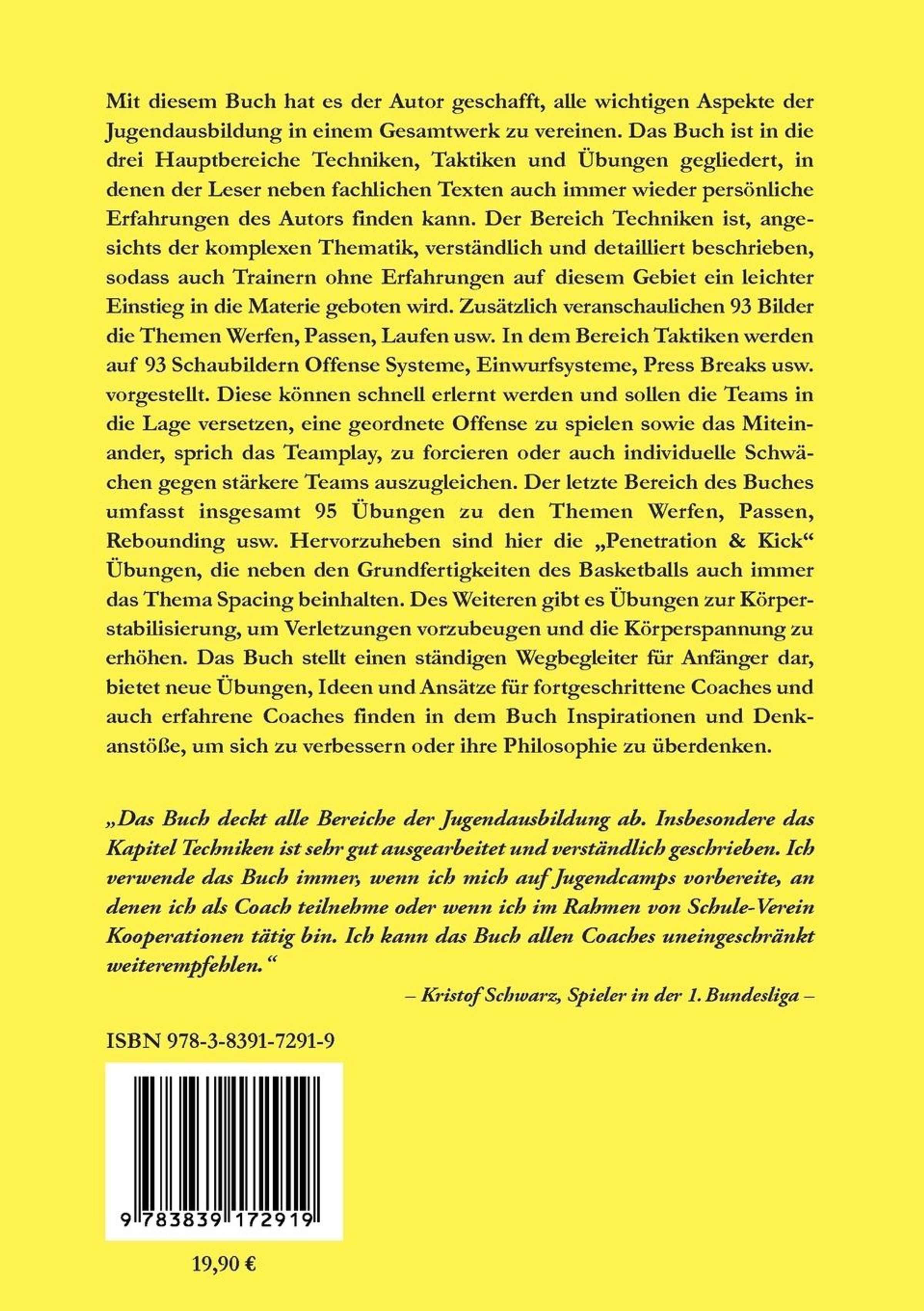 Mit diesem Buch hat es der Autor geschafft, alle wichtigen Aspekte der Jugendausbildung in einem Gesamtwerk zu vereinen. Das Buch ist in die drei Hauptbereiche Techniken, Taktiken und Übungen gegliedert, in denen der Leser neben fachlichen Texten auch immer wieder persönliche Erfahrungen des Autors finden kann. Der Bereich Techniken ist, angesichts der komplexen Thematik, verständlich und detailliert beschrieben, sodass auch Trainern ohne Erfahrungen auf diesem Gebiet ein leichter Einstieg in die Materie geboten wird. Zusätzlich veranschaulichen 93 Bilder die Themen Werfen, Passen, Laufen usw. In dem Bereich Taktiken werden auf 93 Schaubildern Offense Systeme, Einwurfsysteme, Press Breaks usw. vorgestellt. Diese können schnell erlernt werden und sollen die Teams in die Lage versetzen, eine geordnete Offense zu spielen sowie das Miteinander, sprich das Teamplay, zu forcieren oder auch individuelle Schwächen gegen stärkere Teams auszugleichen. Der letzte Bereich des Buches umfasst insgesamt 95 Übungen zu den Themen Werfen, Passen, Rebounding usw. Hervorzuheben sind hier die ¿Penetration & Kick¿ Übungen, die neben den Grundfertigkeiten des Basketballs auch immer das Thema Spacing beinhalten. Des Weiteren gibt es Übungen zur Körperstabilisierung, um Verletzungen vorzubeugen und die Körperspannung zu erhöhen. Das Buch stellt einen ständigen Wegbegleiter für Anfänger dar, bietet neue Übungen, Ideen und Ansätze für fortgeschrittene Coaches und auch erfahrene Coaches finden in dem Buch Inspirationen und Denkanstöße, um sich zu verbessern oder ihre Philosophie zu überdenken.