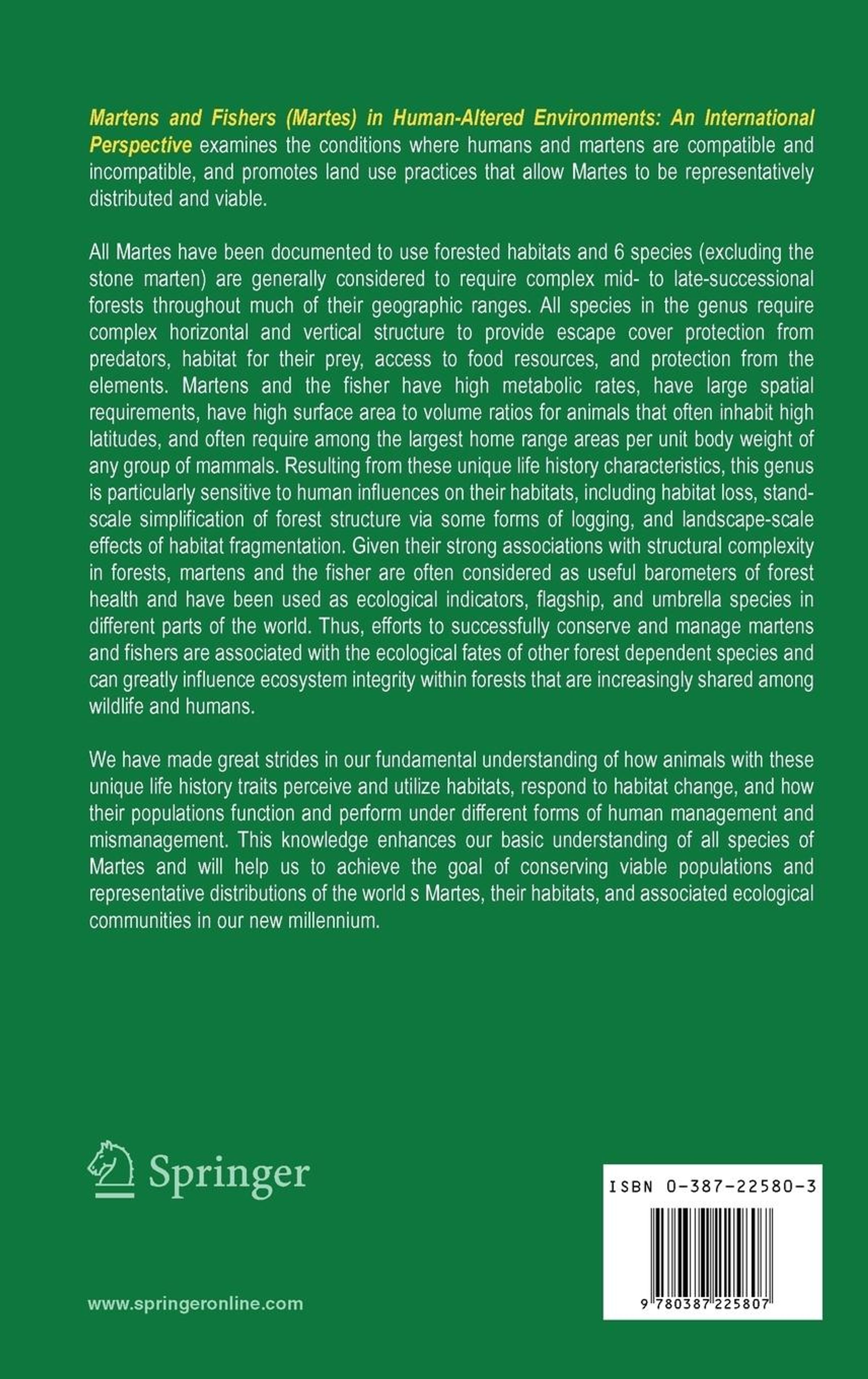 Martens and Fishers (Martes) in Human-Altered Environments: An International Perspective examines the conditions where humans and martens are compatible and incompatible, and promotes land use practices that allow Martes to be representatively distributed and viable.