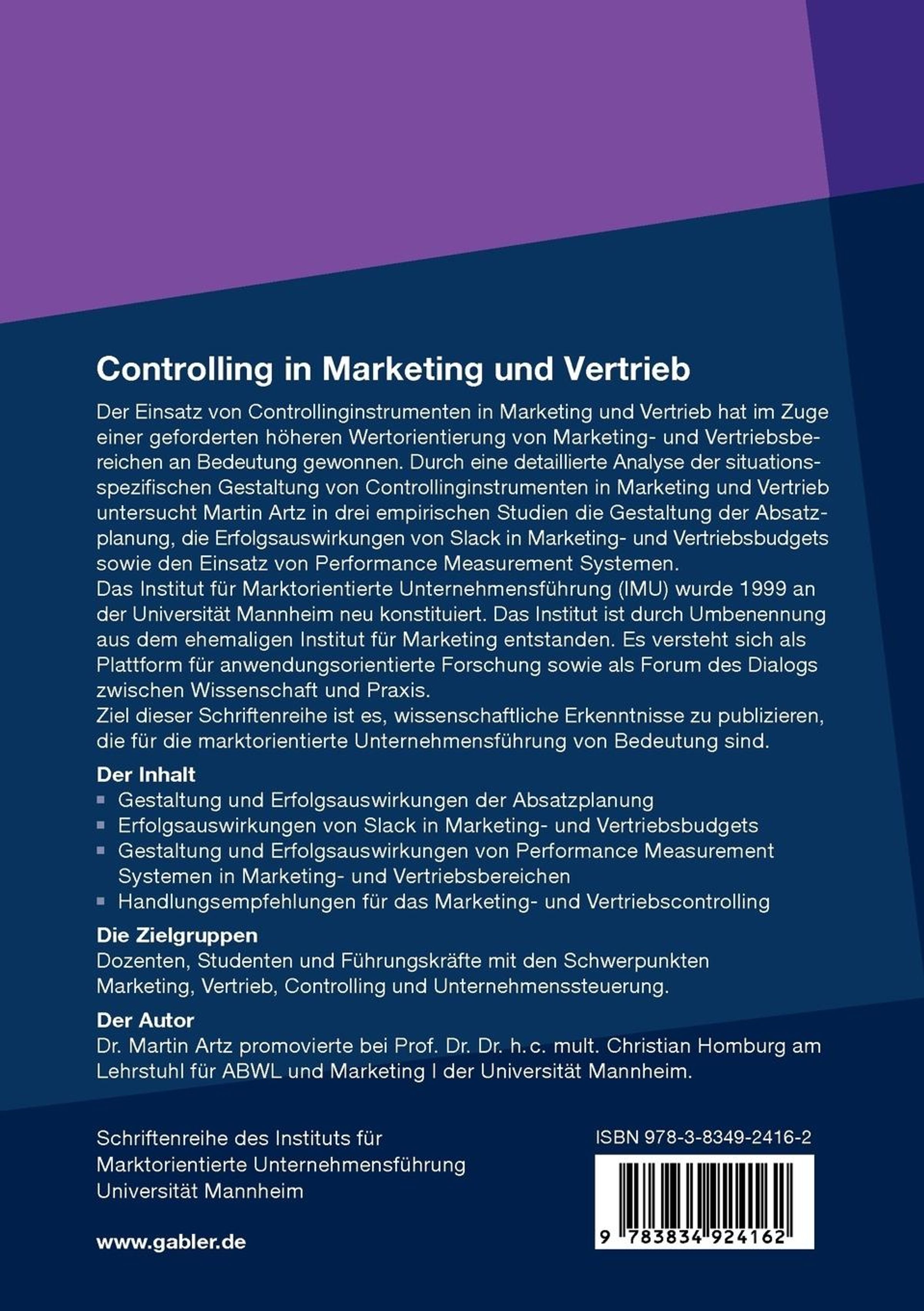 Martin Artz untersucht in drei empirischen Studien die Gestaltung der Absatzplanung, die Erfolgsauswirkungen von Slack in Marketing- und Vertriebsbudgets sowie den Einsatz von Performance Measurement Systemen in Marketing und Vertrieb.