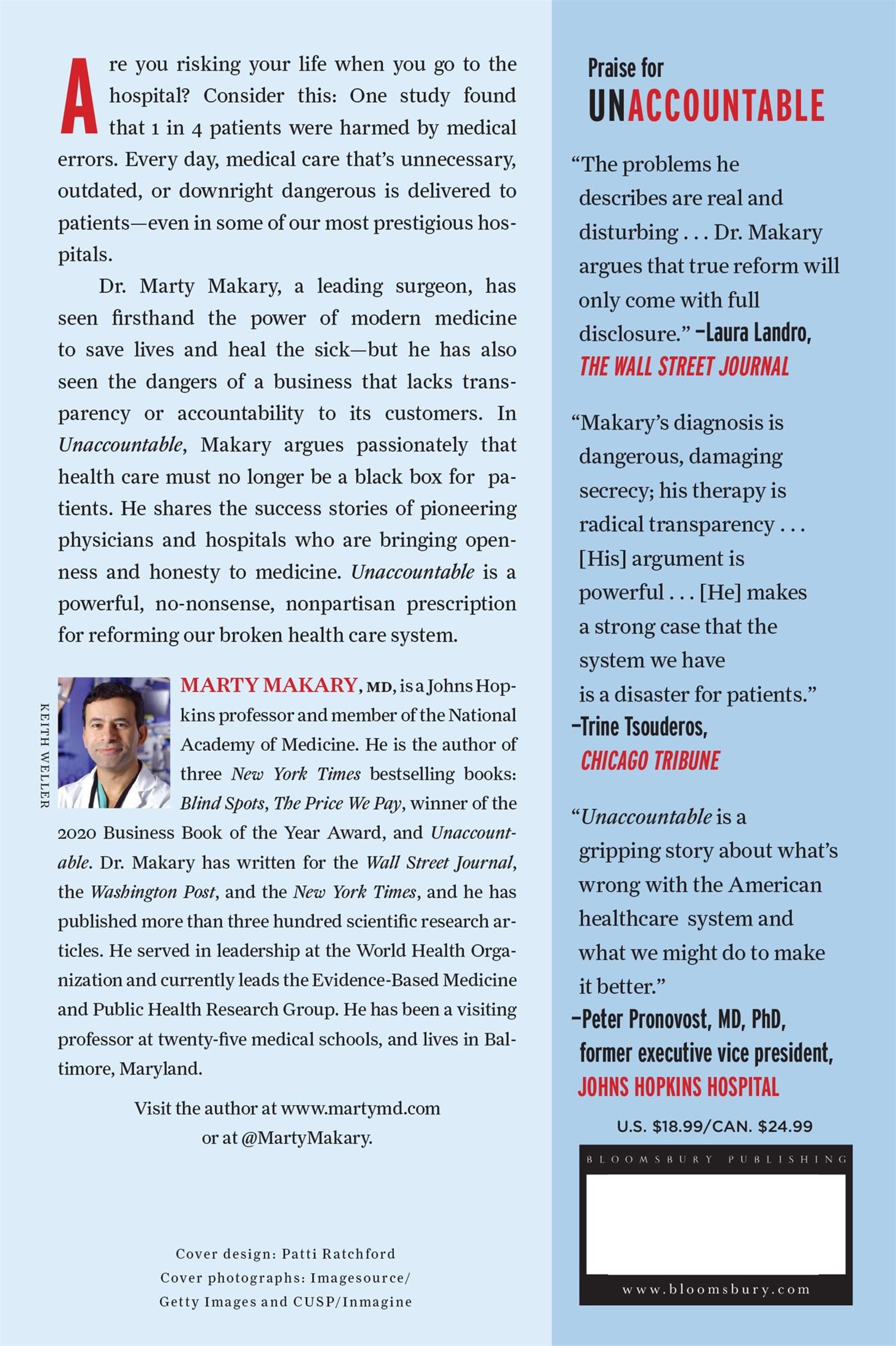 "Every once in a while a book comes along that rocks the foundations of an established order that's seriously in need of being shaken. The modern American hospital is that establishment and Unaccountableis that book."-Shannon Brownlee, author of Overtreated Dr. Marty Makary is co-developer of the life-saving checklist outlined in Atul Gawande's bestselling The Checklist Manifesto. As a busy surgeon who has worked in many of the best hospitals in the nation, he can testify to the amazing power of modern medicine to cure. But he's also been a witness to a medical culture that routinely leaves surgical sponges inside patients, amputates the wrong limbs, and overdoses children because of sloppy handwriting.