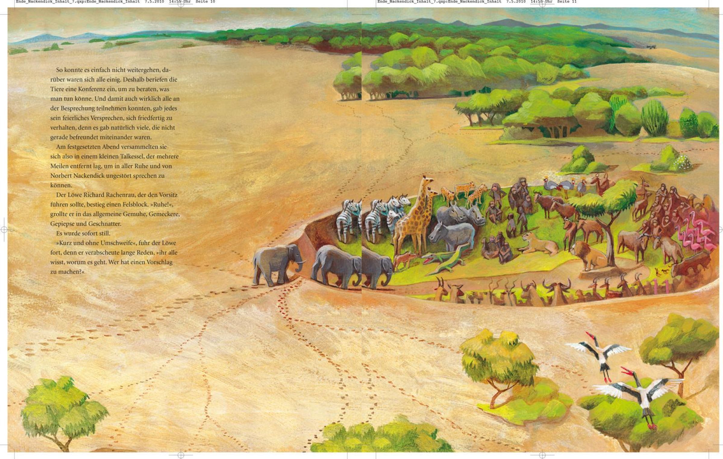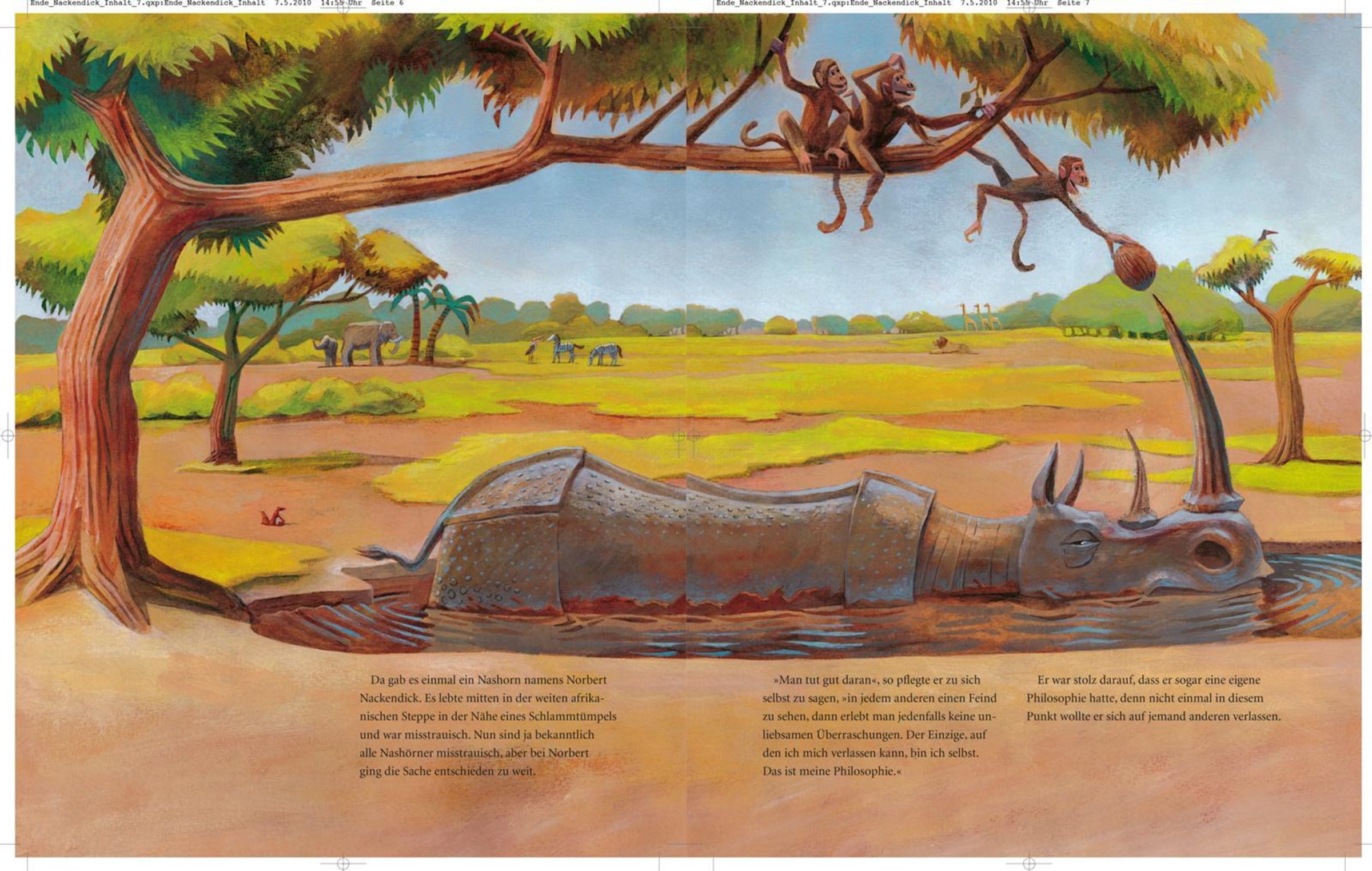 Norbert Nackendick ist unerträglich. Als gut gepanzertes Nashorn verströmt er den anderen Tieren gegenüber eine Angst einflössende Feindseligkeit. Die Bedrohung geht so weit, dass die Tiere sich nicht mehr zum Trinken und Baden an den Wassertümpel wagen und schließlich alle wegziehen. Nur ein kleiner mutiger Vogel, Karlchen Klammerzeh, bleibt bei ihm. Und zeigt ihm seinen größten Feind: sich selbst.