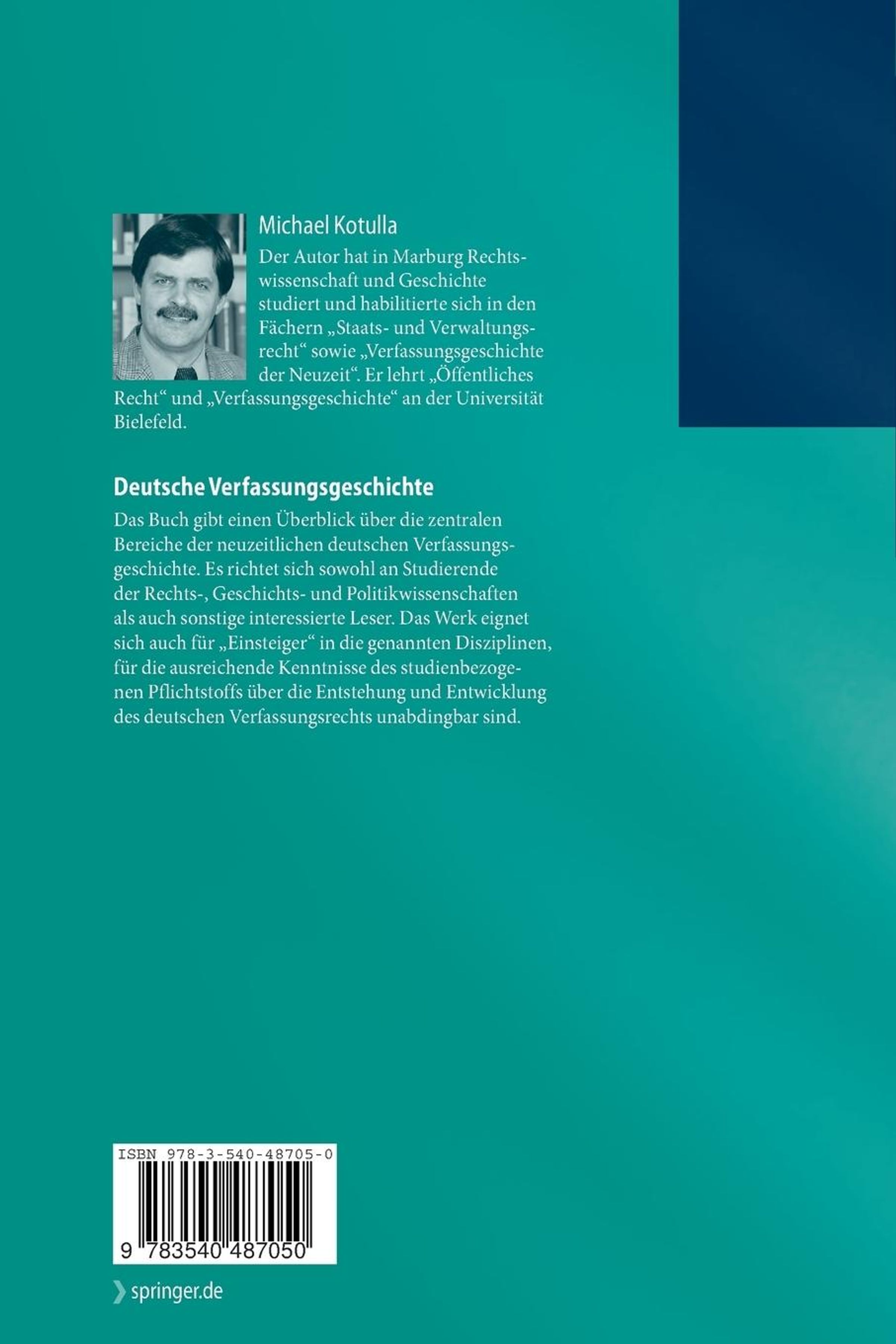 Das Buch gibt einen Überblick über die zentralen Bereiche der neuzeitlichen deutschen Verfassungsgeschichte. Es richtet sich sowohl an Studierende der Rechts-, Geschichts- und Politikwissenschaften als auch sonstige interessierte Leser. Das Werk eignet sich auch für "Einsteiger" in die genannten Disziplinen, für die ausreichende Kenntnisse des studienbezogenen Pflichtstoffs über die Entstehung und Entwicklung des deutschen Verfassungsrechts unabdingbar sind.