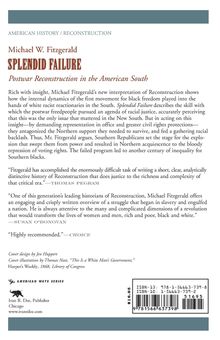 Since the civil rights era of the 1960s, revisionist historians have been sympathetic to the racial justice motivations of the Radical Republican Reconstruction policies that followed the Civil War. But this emphasis on positive goals and accomplishments has obscured the role of the Republicans in the overthrow of their own program. Rich with insight, Michael W. Fitzgerald's new interpretation of Reconstruction shows how the internal dynamics of this first freedom movement played into the hands of white racist reactionaries in the South. Splendid Failure recounts how postwar financial missteps and other governance problems quickly soured idealistic Northerners on the practical consequences of the Radical Republican plan, and set the stage for the explosion that swept Southern Republicans from power and resulted in Northern acquiescence to the bloody repression of voting rights. The failed strategy offers a chastening example to present-day proponents of racial equality.