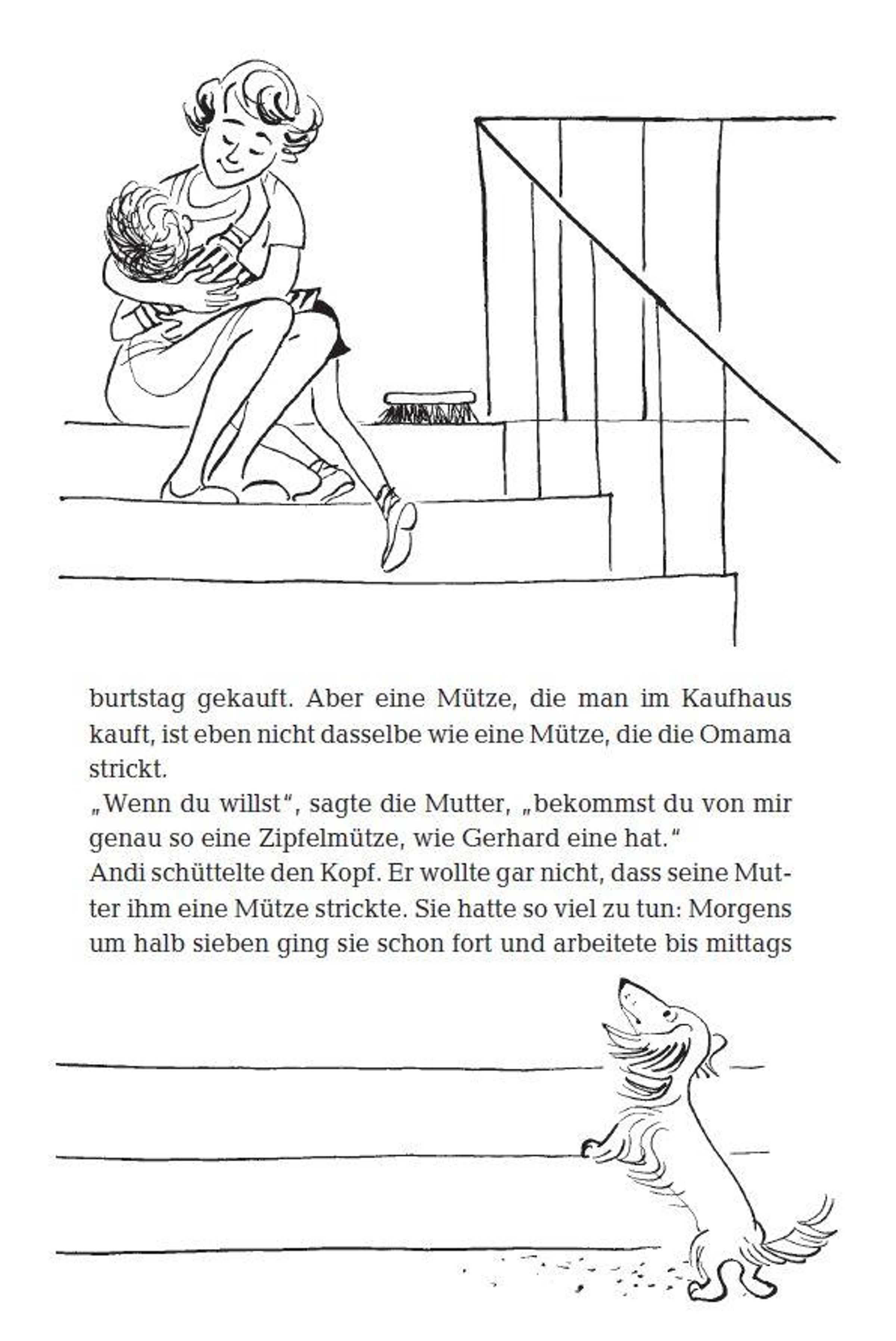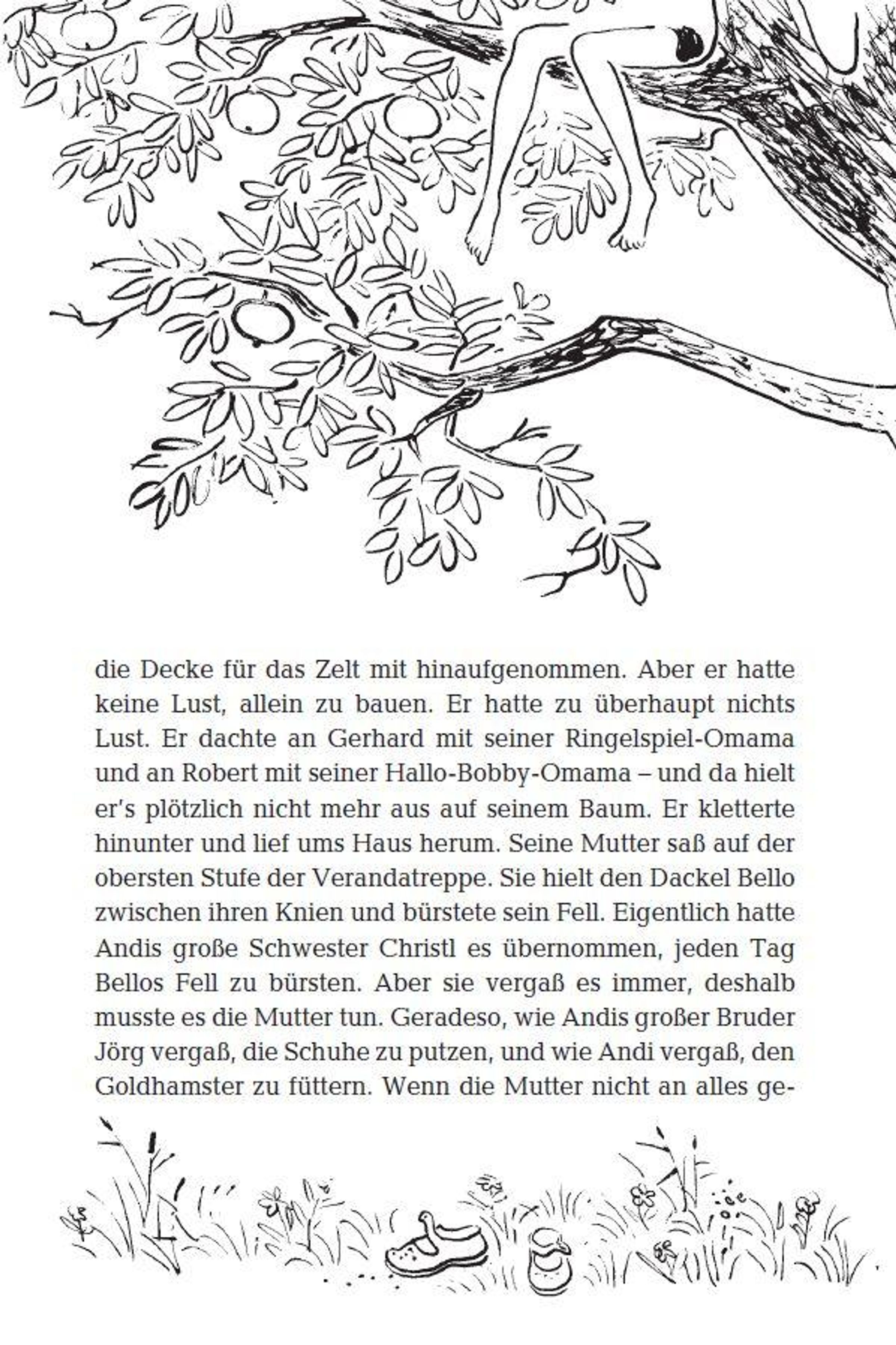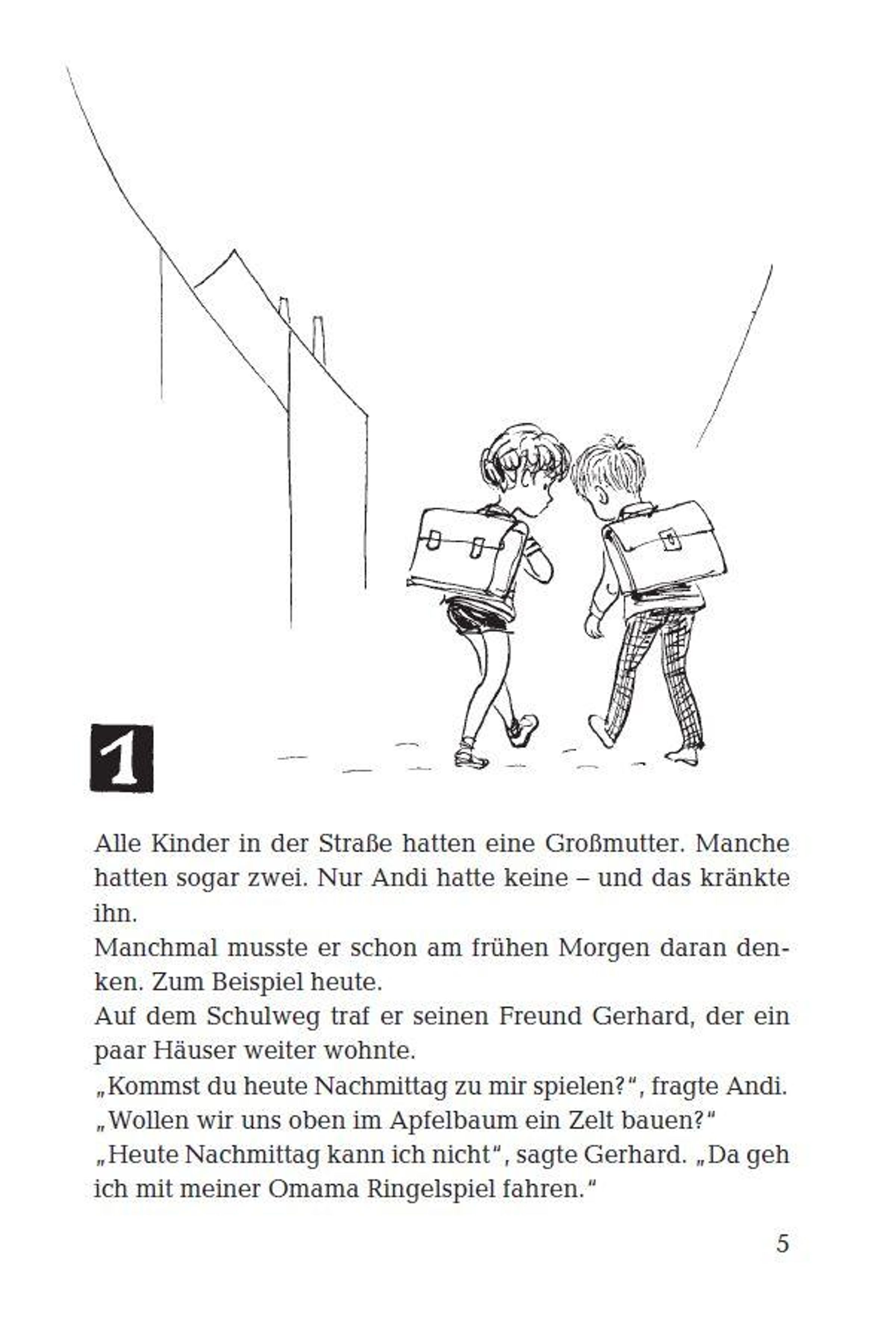 Andi ist traurig, weil ausgerechnet er keine Oma hat. Und dann sind es plötzlich zwei: eine, die sein Versteck im Apfelbaum kennt, und mit der er die tollsten Abenteuer erlebt. Sie fährt ein himmelblaues Auto und reitet auf einem Tiger nach Indien. Die zweite Oma backt ihm Zwetschkenkuchen, ist sehr gemütlich und lässt sich von Andi gerne umsorgen.