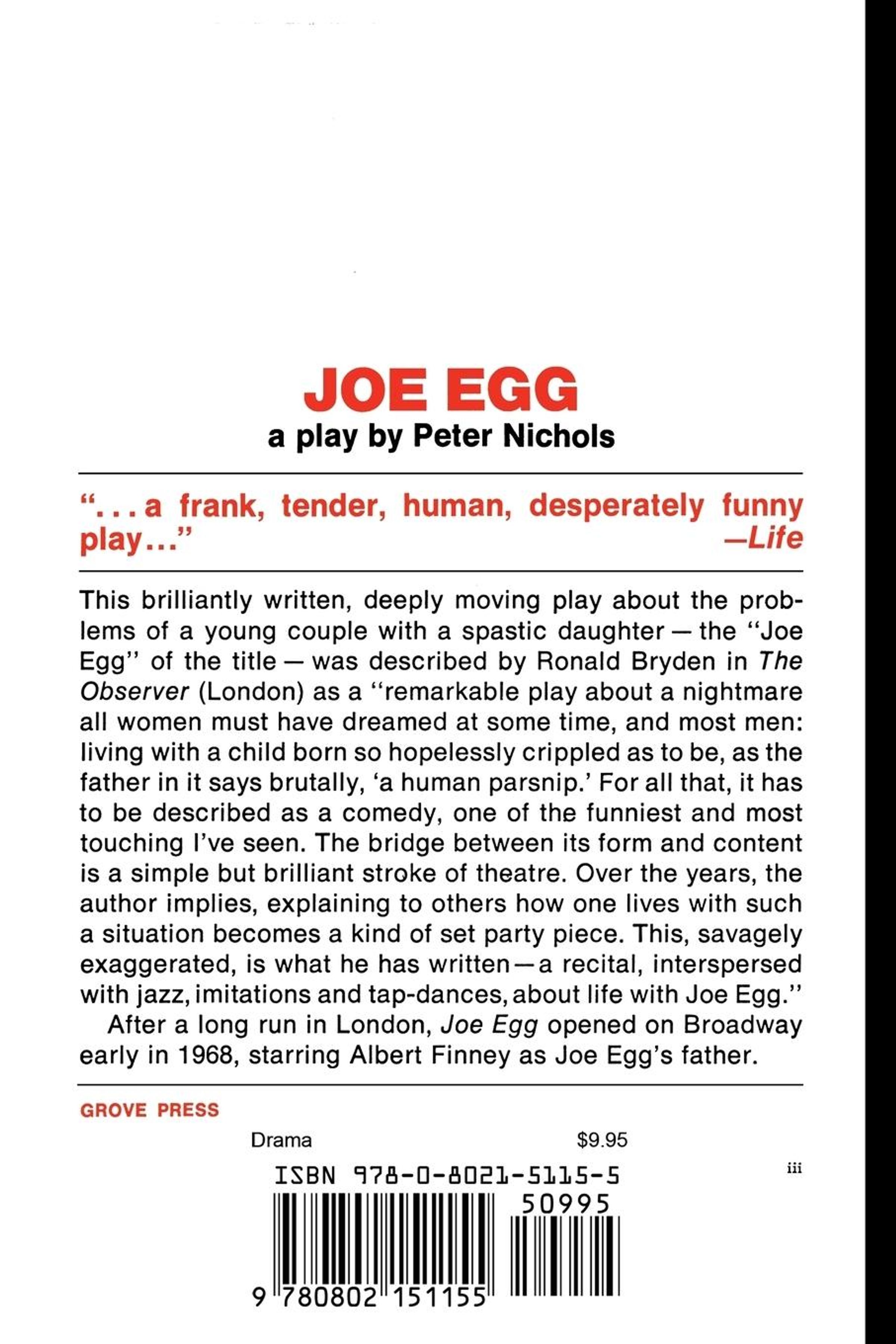 This brilliantly written, deeply moving play about the problems of a young couple with a spastic daughter-the "Joe Egg" of the title-was described by Ronald Bryden in The Observer (London) as a "remarkable play about a nightmare all women must have dreamed at some time, and most men: living with a child born so hopelessly crippled as to be, as the father in it says brutally, a human parsnip. For all that, it has to be described as a comedy, one of the funniest and most touching I've seen. The bridge between its form and content is a simple but brilliant stroke of theatre. Over the years, the author implies, explaining to others how one lives with such a situation becomes a kind of set party piece. This, savagely exaggerated, is what he has written-a recital, interspersed with jazz, imitations and tap-dances, about life with Joe Egg."