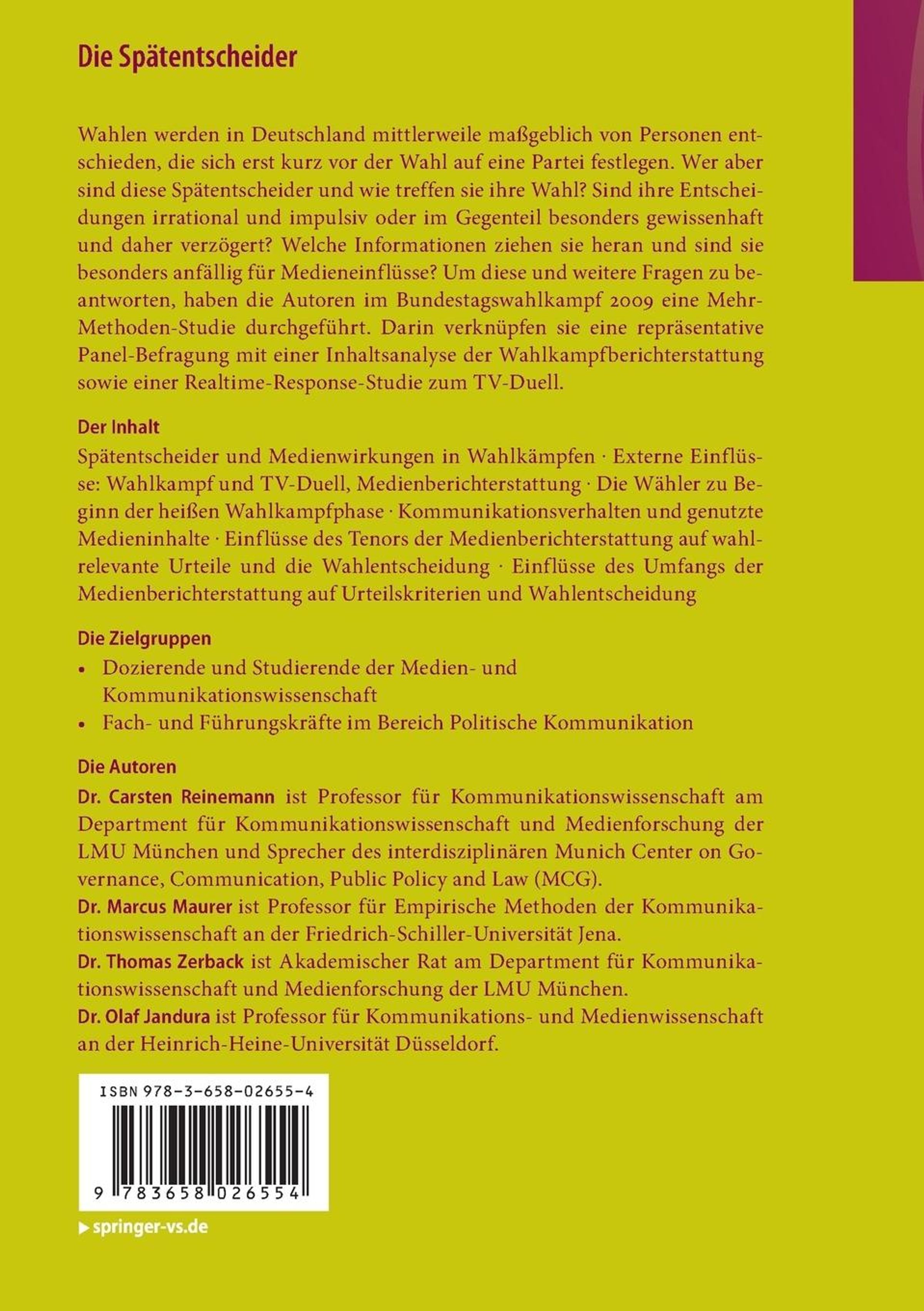 Wahlen werden in Deutschland mittlerweile maßgeblich von Personen entschieden, die sich erst kurz vor der Wahl auf eine Partei festlegen. Wer aber sind diese Spätentscheider und wie treffen sie ihre Wahl? Sind ihre Entscheidungen irrational und impulsiv oder im Gegenteil besonders gewissenhaft und daher verzögert? Welche Informationen ziehen sie heran und sind sie besonders anfällig für Medieneinflüsse? Um diese und weitere Fragen zu beantworten, haben die Autoren im Bundestagswahlkampf 2009 eine Mehr-Methoden-Studie durchgeführt. Darin verknüpfen sie eine repräsentative Panel-Befragung mit einer Inhaltsanalyse der Wahlkampfberichterstattung sowie einer Realtime-Response-Studie zum TV-Duell.