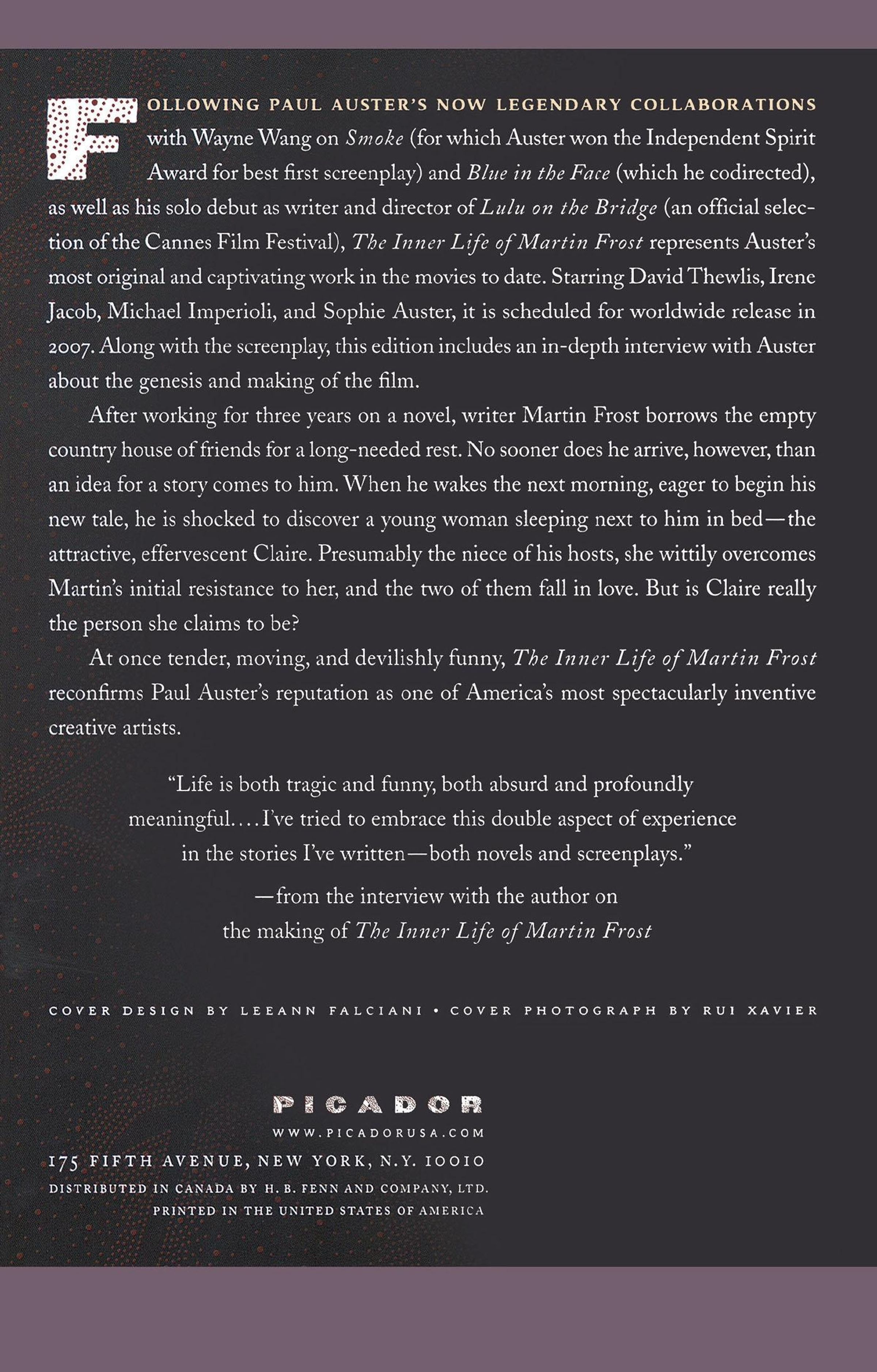 Written and directed by bestselling and award-winning author Paul Auster, t he screenplay for The Inner Life of Martin Frost, starring David Thewlis, Irene Jacob, Michael Imperioli, and Sophie Auster.