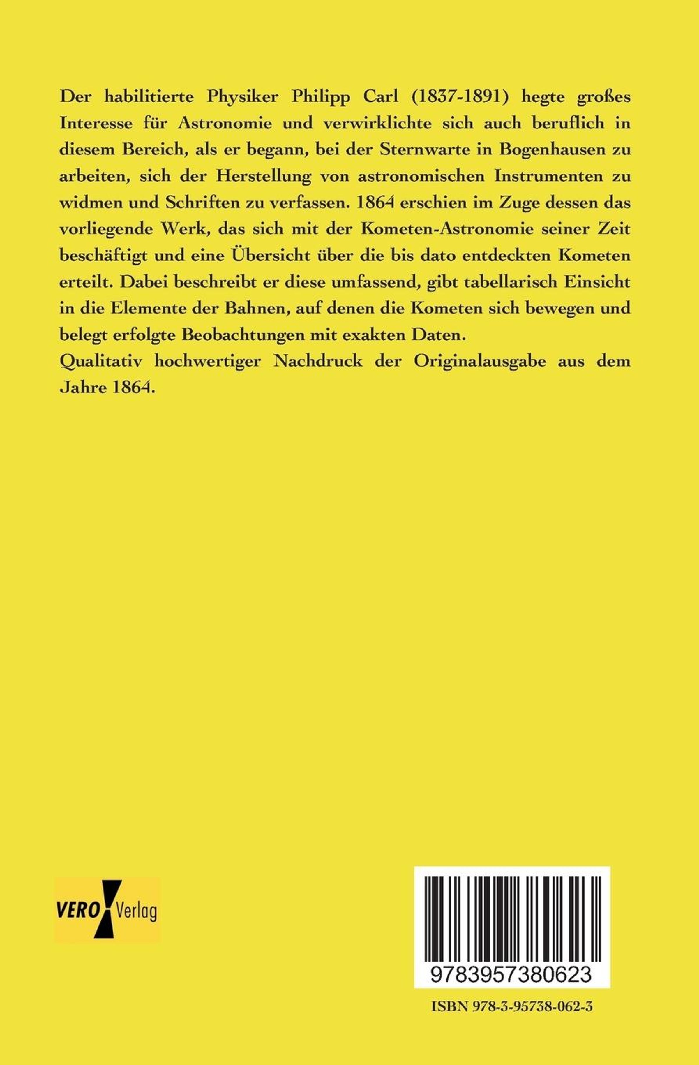 Der habilitierte Physiker Philipp Carl (1837-1891) hegte großes Interesse für Astronomie und verwirklichte sich auch beruflich in diesem Bereich, als er begann, bei der Sternwarte in Bogenhausen zu arbeiten, sich der Herstellung von astronomischen Instrumenten zu widmen und Schriften zu verfassen. 1864 erschien im Zuge dessen das vorliegende Werk, das sich mit der Kometen-Astronomie seiner Zeit beschäftigt und eine Übersicht über die bis dato entdeckten Kometen erteilt. Dabei beschreibt er diese umfassend, gibt tabellarisch Einsicht in die Elemente der Bahnen, auf denen die Kometen sich bewegen und belegt erfolgte Beobachtungen mit exakten Daten. Qualitativ hochwertiger Nachdruck der Originalausgabe aus dem Jahre 1864.