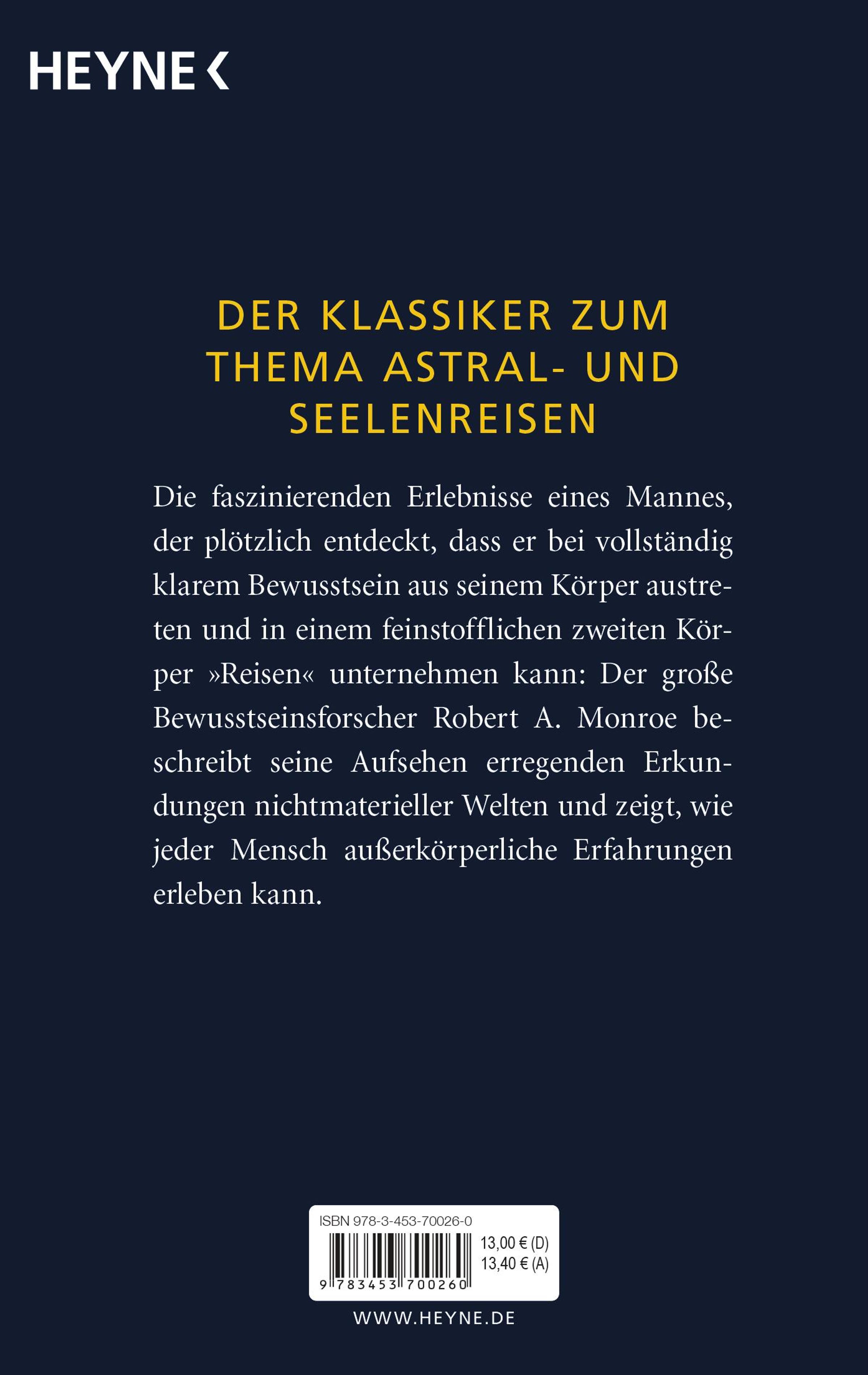 Der Klassiker zum Thema Astral- und Seelenreisen: Der große Bewusstseinsforscher und Erfolgsautor Robert A. Monroe beschreibt seine Aufsehen erregenden Erkundungen nichtmaterieller Welten. Ausführliche Anleitungen, welche die gefahrlose Durchführung eigener Experimente ermöglichen, machen dieses Buch zu einem Muss für den praxisorientierten spirituellen Leser.