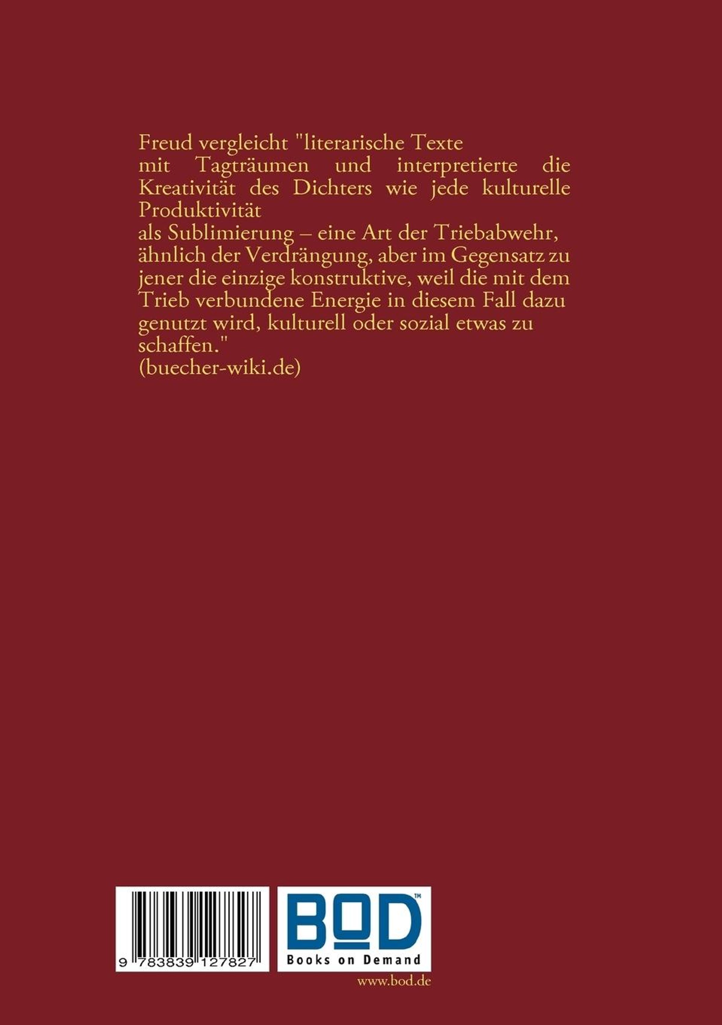 In ¿Der Dichter und das Phantasieren¿,schreibt buecher-wiki. de, "verglich Freud literarische Texte mit Tagträumen und interpretierte die Kreativität des Dichters wie jede kulturelle Produktivität als Sublimierung ¿ eine Art der Triebabwehr, ähnlich der Verdrängung, aber im Gegensatz zu jener die einzige konstruktive, weil die mit dem Trieb verbundene Energie in diesem Fall dazu genutzt wird, kulturell oder sozial etwas zu schaffen."