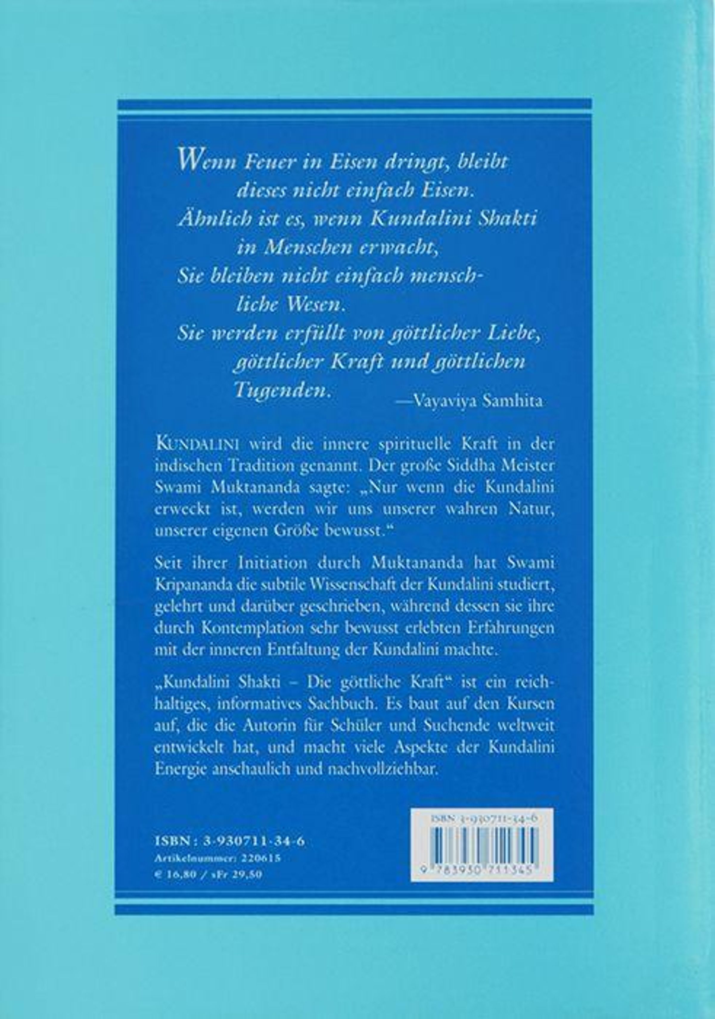 Swami Kripananda hat seit ihrer Initiation durch Swami Muktananda die subtile Wissenschaft der Kundalini studiert, gelehrt und über sie geschrieben, während sie ihre eigenen Erfahrungen mit der inneren Entfaltung der Kundalini machte. "Kundalini Shakti - Die göttliche Kraft" ist ein reichhaltiges, informatives Sachbuch. Es baut auf den Kursen auf, die die Autorin für Schüler und Suchende weltweit entwickelt hat. Die Publikation macht viele Aspekte der Kundalini-Energie anschaulich und nachvollziehbar.