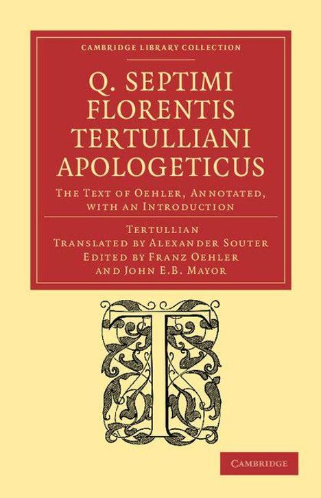 A masterpiece of rhetoric and an impassioned defence of faith in the face of persecution, this work represents a key work in the Latin patristic canon. Addressing the magistrates of the Roman court, Tertullian submits 'the real facts in the case of the Christians', defending the legitimacy of the new faith while charging its detractors with hypocrisy and worse. Scathing, eloquent and defiant, the Apology demonstrates the importance of classical rhetoric to the identity of the controversial religion and its recent converts. This edition (1917), accompanied by a complete commentary by J. E. B. Mayor and translation by Alexander Souter, has been called 'by the far the best commentary ever published' on the work. Published posthumously from Mayor's extensive Cambridge lecture notes, the commentary is a starting point for anyone seeking a full understanding of the text's critical history. Souter's English translation makes it accessible to experts and non-experts alike.
