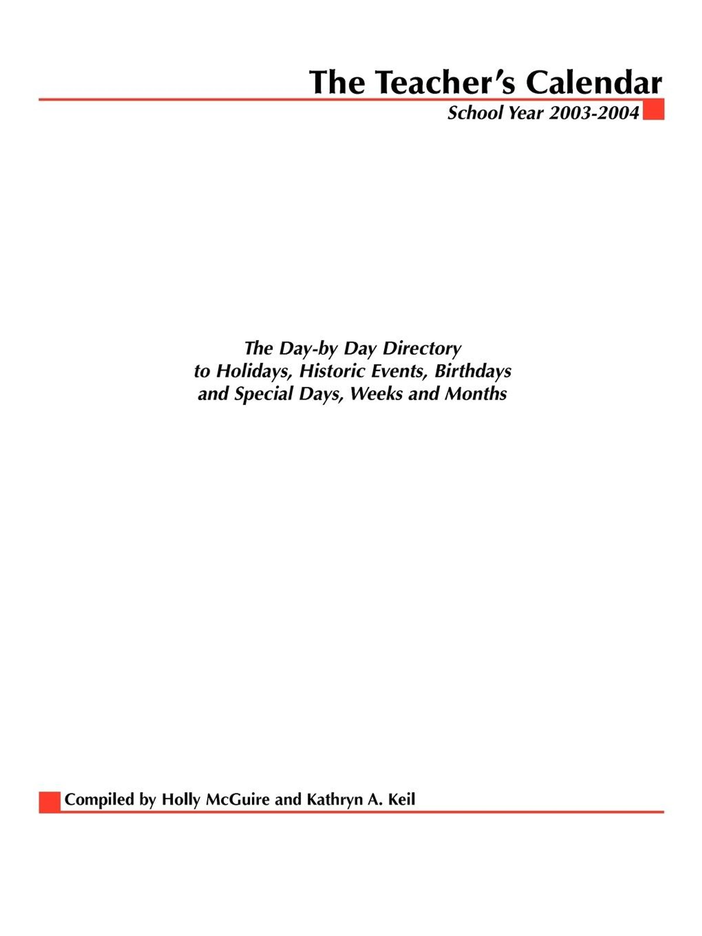 The 2003-2004 edition of this indispensable calendar for teachers grades K-8 contains hundreds of updated events and activities, including: Details and contact information for events celebrating the Lewis and Clark Expedition Bicentennial and the Wright Brothers' First Powered Flight Centennial More fascinating historical anniversaries, including the Locust Plague of 1874 (July 20), Blackbeard the Pirate's death anniversary (November 22) and the date the world's largest, smelliest flower was found (August 6) Expanded science and nature entries, including dates for annual meteor showers, the migration seasons for whooping cranes and monarch butterflies and anniversaries of scientific milestones such as the day the "Iceman" mummy was discovered (September 19) Hundreds of new "Birthday Todays," including more than 150 sports figures such as pro football superstars Brett Favre, Michael Vick, Ricky Williams and league MVP Rich Gannon, baseball's Rookies of the Year Eric Hinske and Jason Jennings, new NBA sensation Yao Ming, and U. S. soccer stars Landon Donovan and Damarcus Beasley The premiere anniversaries of the TV shows "SpongeBob Squarepants," "Lizzie McGuire," "Hey Arnold!," "The Wild Thornberries" and "The Powerpuff Girls" Contact information for the senators and governors from all 50 states Current and past winners of national children's book awards, including the Coretta Scott King Awards, Newbery and Caldecott Medals and all Honor Books Information on all the state fairs, on important teacher conferences, on student contests (spelling andgeography bees) and more!