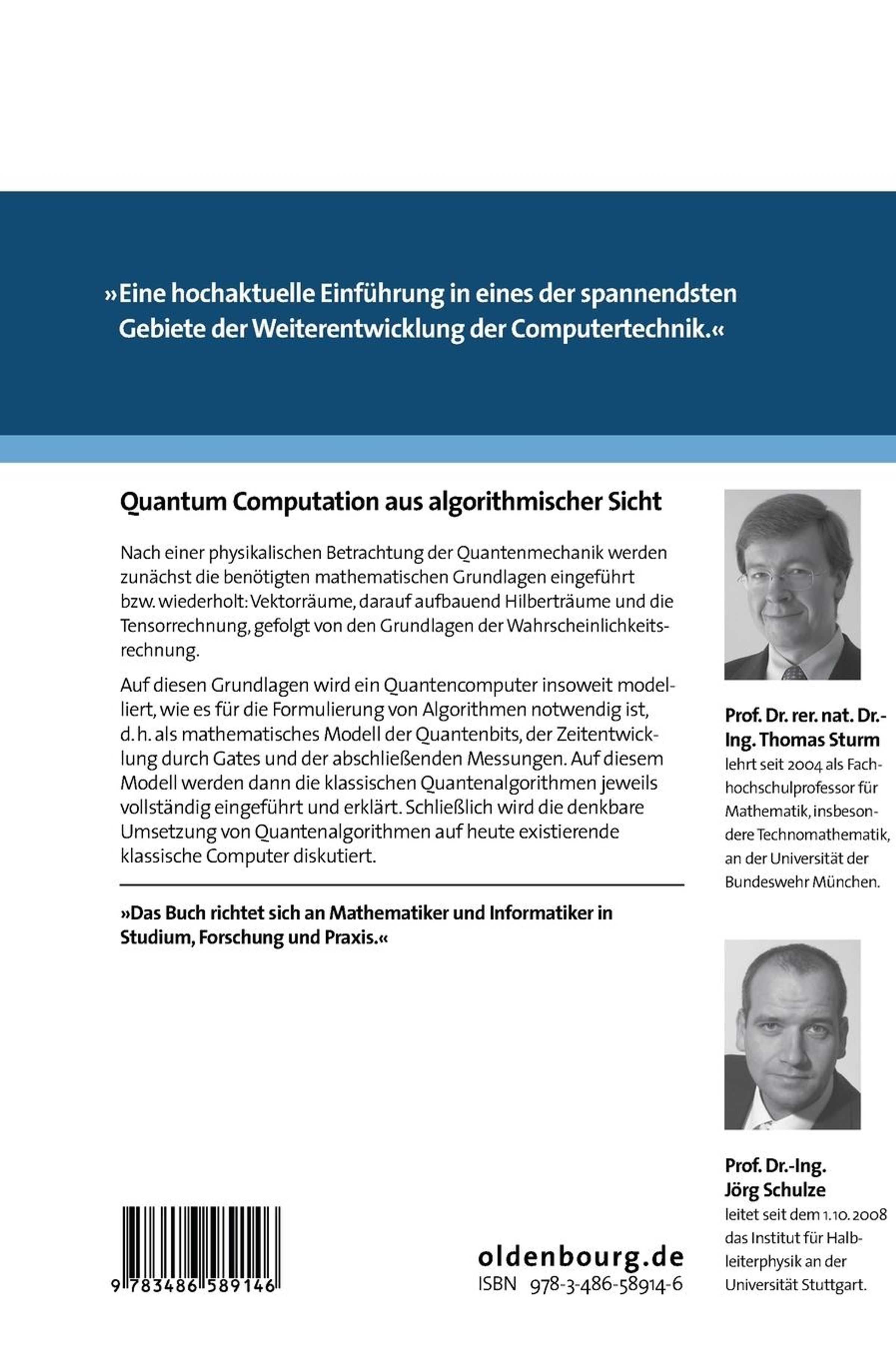 Nach einer physikalischen Betrachtung der Quantenmechanik werden zunächst die benötigten mathematischen Grundlagen eingeführt bzw. wiederholt: Vektorräume, darauf aufbauend Hilberträume und die Tensorrechnung, gefolgt von den Grundlagen der Wahrscheinlichkeitsrechnung. Auf diesen Grundlagen wird ein Quantencomputer insoweit modelliert, wie es für die Formulierung von Algorithmen notwendig ist, d. h. als mathematisches Modell der Quantenbits, der Zeitentwicklung durch Gates und der abschließenden Messungen. Auf diesem Modell werden dann die klassischen Quantenalgorithmen jeweils vollständig eingeführt und erklärt. Schließlich wird die denkbare Umsetzung von Quantenalgorithmen auf heute existierende klassische Computer diskutiert.