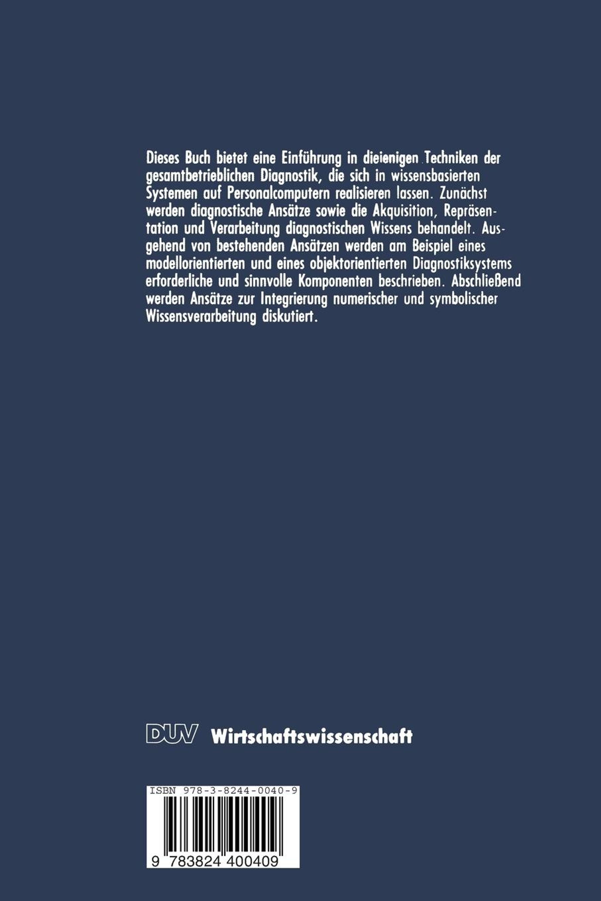 1. Einführung.- 1.1 Motivation und Zielsetzung.- 1.2 Methodik.- 2. Betriebliche Diagnostik.- 2.1 Begriffsabgrenzung.- 2.2 Der diagnostische Prozess.- 2.3 Varianten der betrieblichen Diagnostik.- 2.3.1 Ansätze zur Entscheidungsfindung.- 2.3.2 Modell- und regelbasierte Diagnostik.- 2.3.3 Numerische und nichtnumerische Diagnostik.- 2.4 Analysetechniken.- 2.4.1 Istanalyse.- 2.4.2 Die vergleichende Analyse.- 2.4.3 Best-Case / Worst-Case Analyse.- 2.4.4 Ermittlung von Ursachenbündeln.- 2.4.5 Ermittlung von Reaktionsregeln bei übergeordneten Zielsetzungen.- 2.5 Anwendungsgebiete für Diagnostiksysteme.- 2.5.1 Operative Planung.- 2.5.2 Strategische Planung.- 2.5.3 Unternehmensberatung.- 2.5.4 Universitäre Ausbildung.- 2.5.5 volkswirtschaftliche Prognosen.- 3. Wissensakquisition.- 3.1 Ein Phasenschema zur Wissensakquisition.- 3.2 Quellen zur Erstellung einer Wissensbasis.- 3.3 Strukturierung als Mittel einer effizienten Wissensakquisition.- 3.3.1 Generische Systeme.- 3.3.2 Strukturierung nach betrieblichen Funktionen.- 3.4 Distribution von Wissen auf zentralen und dezentralen Rechenanlagen.- 4. Repräsentation von diagnostischem Wissen.- 4.1 Regelbasierte Wissensrepräsentation.- 4.1.1 Prinzip einer Regelbasis.- 4.1.2 Die klassische Propositionenlogik.- 4.1.3 Die Prädikatenlogik erster Ordnung.- 4.1.4 Die situationsabhängige Logik.- 4.1.5 Berücksichtigung von Datenunsicherheit in regelbasierten Systemen.- 4.1.6 Regel-Hierarchien.- 4.1.7 Die Datenstruktur von Regelbasen.- 4.1.8 Die Bedeutung regelbasierter Systeme für die betriebliche Diagnostik.- 4.2 Modellbasierte Wissensrepräsentation.- 4.2.1 Modelltypen.- 4.2.2 Optimierungsmodelle.- 4.2.3 Simulationsmodelle.- 4.2.4 Die Bedeutung numerischer Modelle für die betriebliche Diagnostik.- 4.3 Objektorientierte Wissensrepräsentation.- 4.3.1 Semantische Netze.- 4.3.2 Frames.- 4.3.3 Konnektionistische Modelle.- 4.3.4 Die Bedeutung von Wissensnetzen für die betriebliche Diagnostik.- 5. Instrumentarium zur Verarbeitung diagnostischen Wissens.- 5.1 Einfache Formen der Diagnostik.- 5.2 Assoziative Systeme.- 5.2.1 Regelbasierte Systeme.- 5.2.1.1 Datengesteuerte Vorgehensweise.- 5.2.1.2 Zielgesteuerte Vorgehensweise.- 5.2.1.3 Kombinierte Vorgehensweisen.- 5.2.2 Wissensverarbeitung in Netzen.- 5.2.2.1 Aufnahme von bedingten Relationen in semantische Netze.- 5.2.2.2 Aktive Objekte.- 5.3 Modellbasierte Diagnostiksysteme.- 5.3.1 Analytische Verfahren.- 5.3.2 Simulation.- 5.3.2.1 Begriffsabgrenzung.- 5.3.2.2 Einsatzmöglichkeiten für die Wissensverarbeitung.- 5.4 Software zur Systementwicklung.- 5.5 Erforderliche Hardware.- 5.6 Konzepte zur Parallelverarbeitung.- 6. Bisher verfügbare Werkzeuge zur Erstellung von Diagnostik-Expertensystemen.- 6.1 Betriebliche Diagnostiksysteme.- 6.2 Medizinische Diagnostiksysteme.- 6.3 Diagnostiksysteme in Naturwissenschaft und Technik.- 6.4 Anbindung an Datenbanksysteme.- 6.5 Übertragbarkeit auf die betriebliche Diagnostik und weitere Anforderungen.- 7. SIMUPLAN Ein integriertes Datenbank- und Modellgeneratorsystem zur Unterstützung der numerischen Diagnostik.- 7.1 Motivation.- 7.2 Phasen der numerischen Diagnostik.- 7.3 Anforderungen an ein System zur Verarbeitung einer komplexen Wissensbasis.- 7.4 Wissensrepräsentation.- 7.4.1 Struktur der Wissensbasis.- 7.4.2 Der Elementarbaustein des Modells.- 7.4.3 Beziehungen unter Elementarbausteinen.- 7.4.4 Strukturierung durch Unternehmensmodule.- 7.4.5 Formulierung der Zielfunktion.- 7.4.6 Ebenen der Wissensakquisition.- 7.5 Wissensverarbeitung.- 7.5.1 Problemspezifische Modellgenerierung.- 7.5.2 Durchführung der Simulation.- 7.6 Die Programmstruktur.- 7.7 Die Datenstruktur.- 7.8 Hard- und Software.- 7.9 Systembestandteile.- 7.9.1 Der Modell-Editor.- 7.9.2 Der Report-Editor.- 7.9.3 Der Analyse-Editor.- 7.9.4 Der Programmgenerator.- 7.10 Beispiele und Zeitmessungen.- 7.11 Abschließende Bewertung von SIMUPLAN.- 8. PROJECTOR Ein Generator wissensbasierter Klassifikationssysteme zur Unterstützung der assoziati